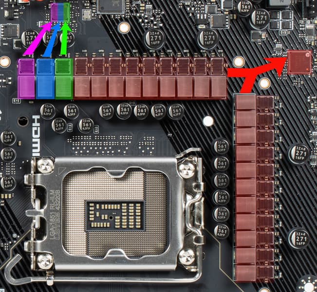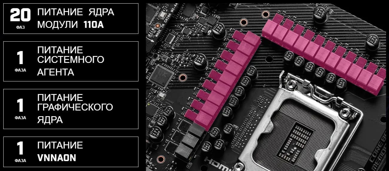 Схема питания процессора выполнена по схеме 20+1+1+1 (всего 23 фазы: 20 на VCore (ядро процессора), 1 на iGPU (интегрированное графическое ядро), 1 на VCCSA (System Agent, кольцевая шина) и 1 на VNNAON (управление энергосбережением).