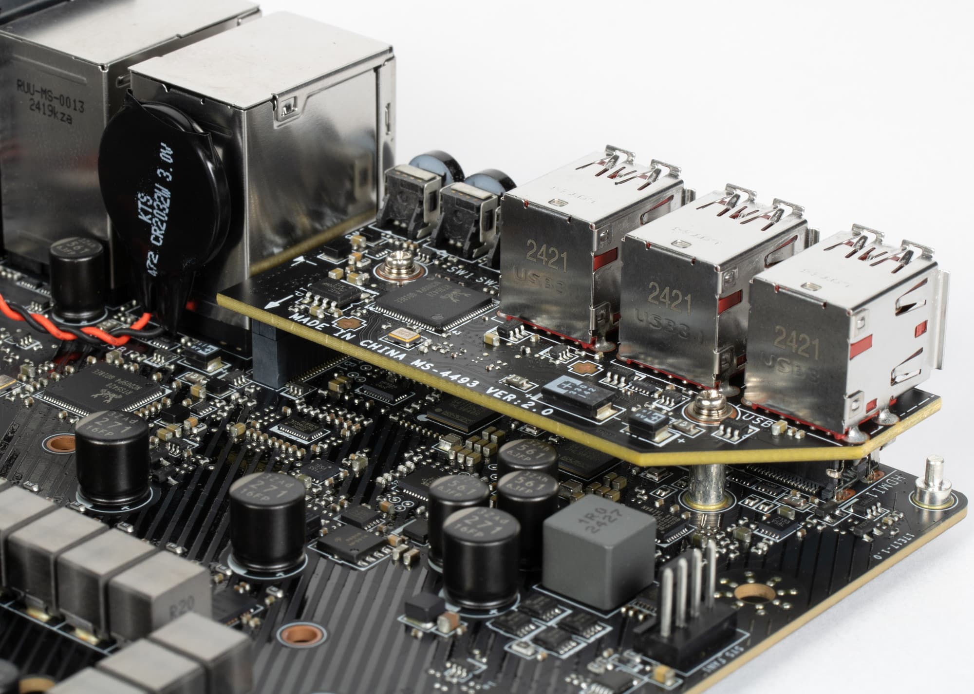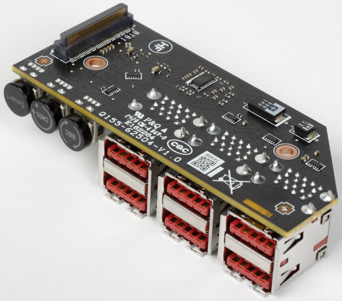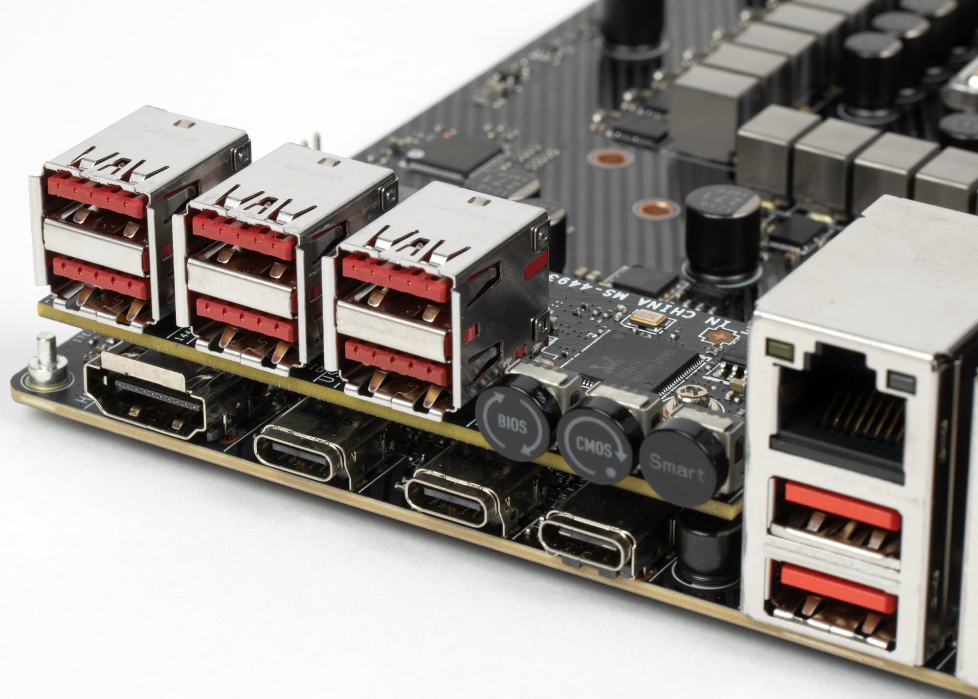 Очевидно, что задняя панель просто переполнена портами, и мы впервые видим интересную реализацию портов – в 2 «этажа». На левом верхнем углу матплаты над четырьмя портами (HDMI и три Type-C) расположена небольшая плата, несущая на себе аж 6 портов Type-A (3.2 Gen2) и три кнопки управления.