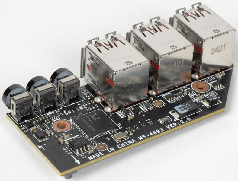При этом один из хабов USB 3.2 Gen2 – Realtek RTS5420 расположен на этой дополнительной карте, обеспечивая работу 4х (из 6ти) портов USB 3.2 Gen2 Type-A.