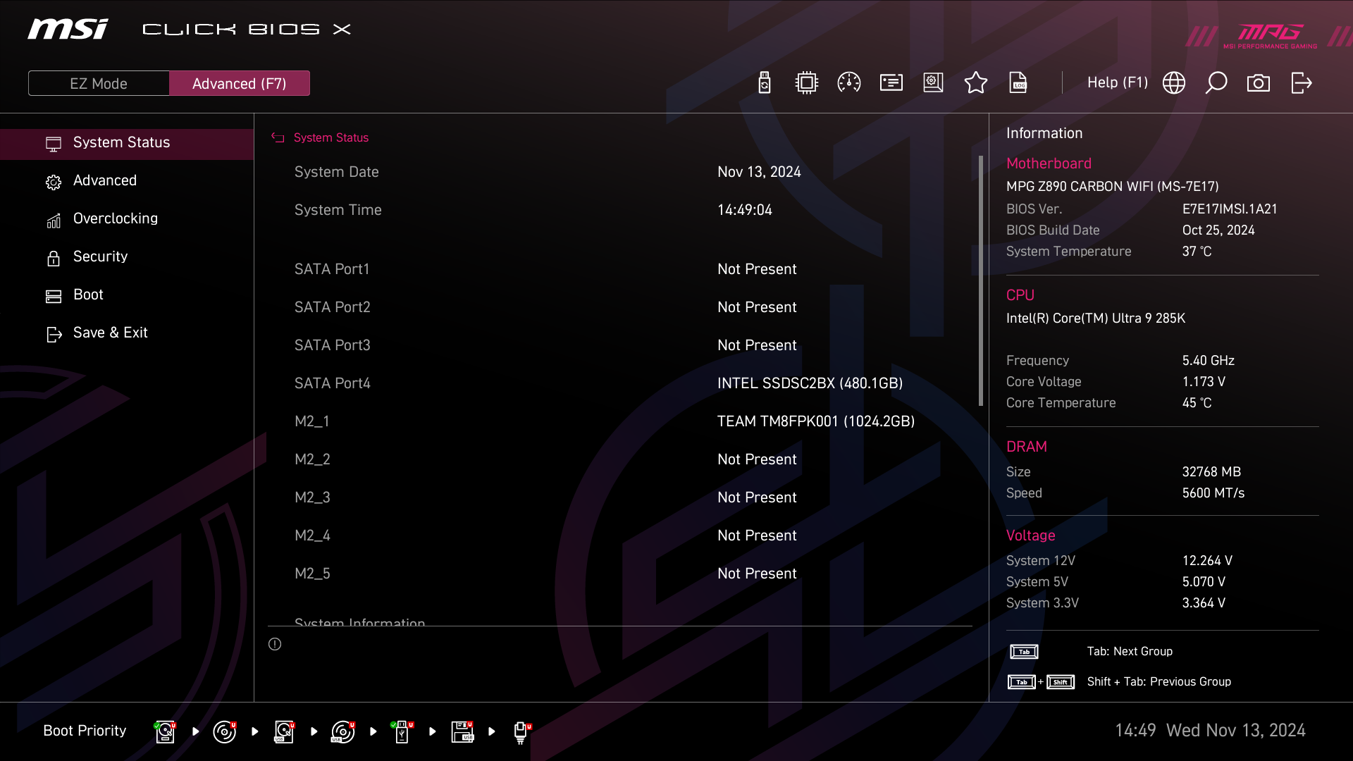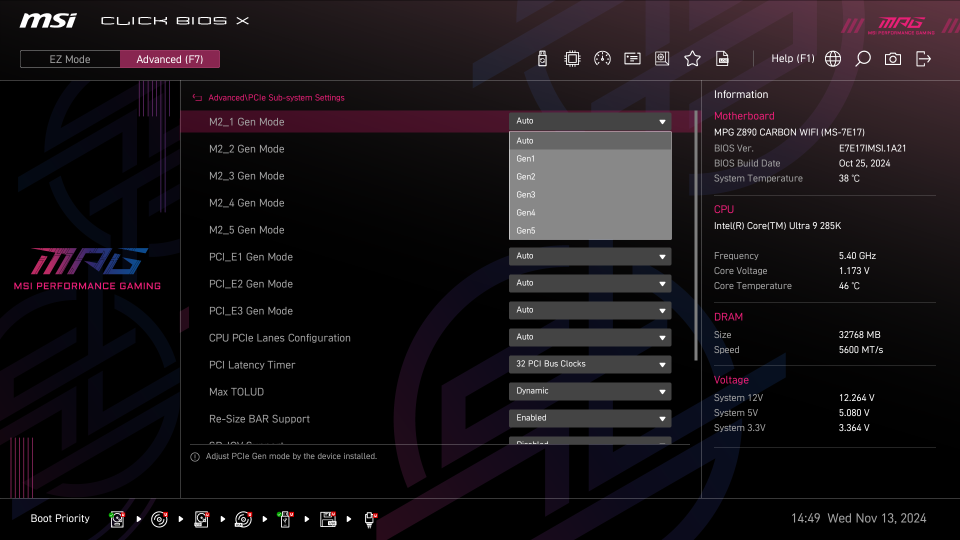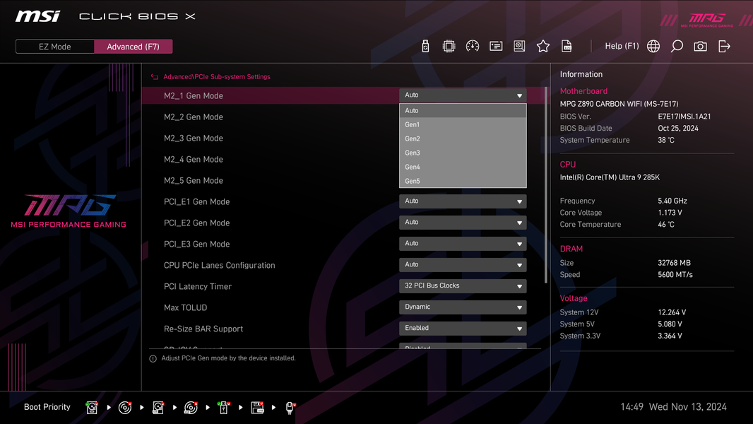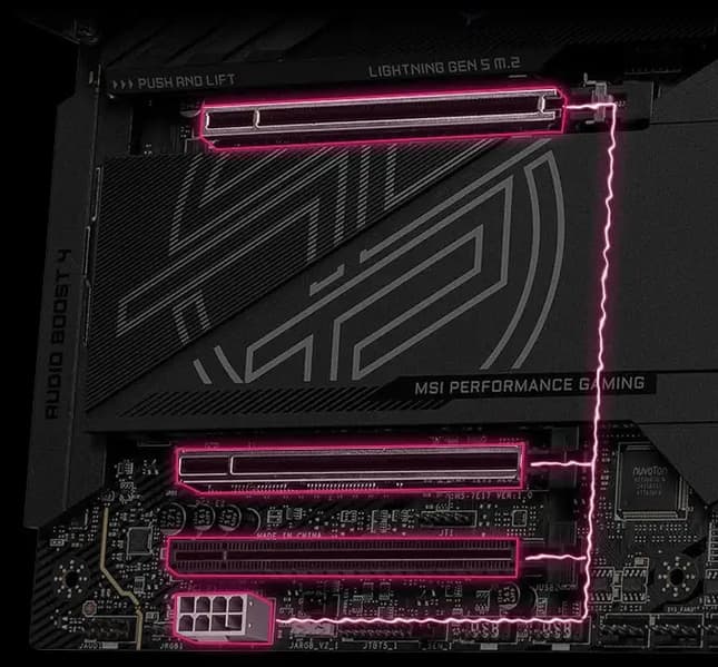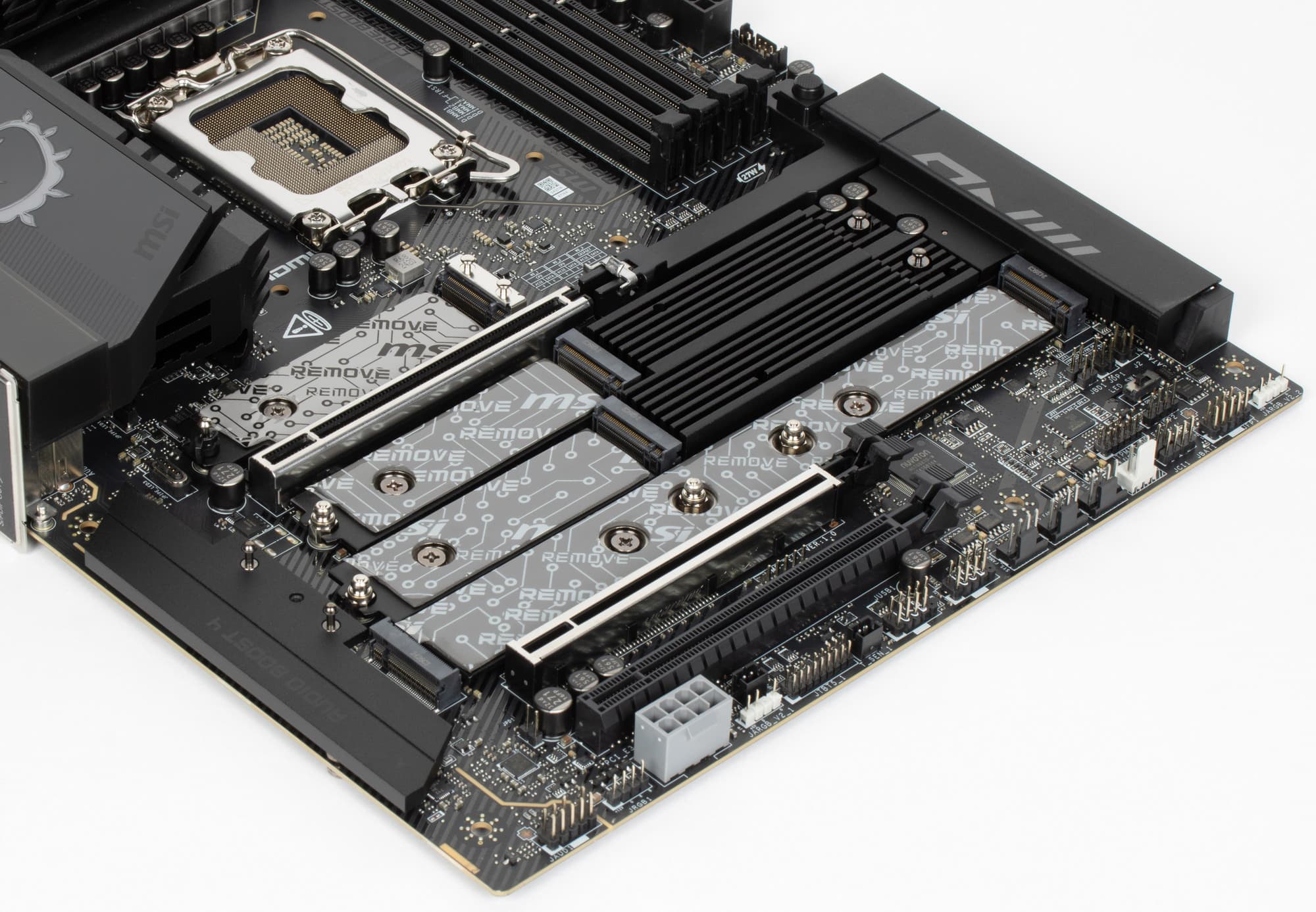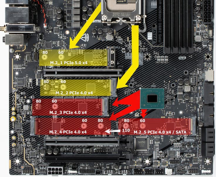 Третий, четвертый и пятый слоты M.2 (M.2_3, M.2_4, M.2_5) получают данные от чипсета Z890, а первые два — от CPU, при этом M.2_1 получает PCIe 5.0, а M.2_2 получает от процессора PCIe 4.0.