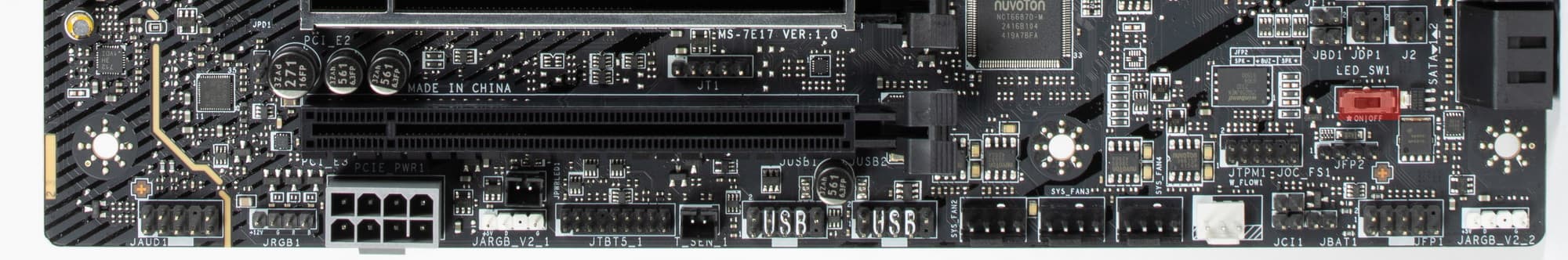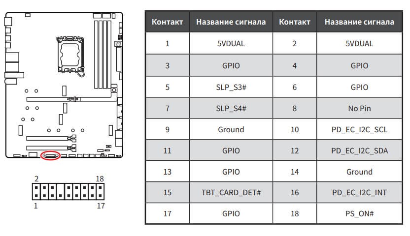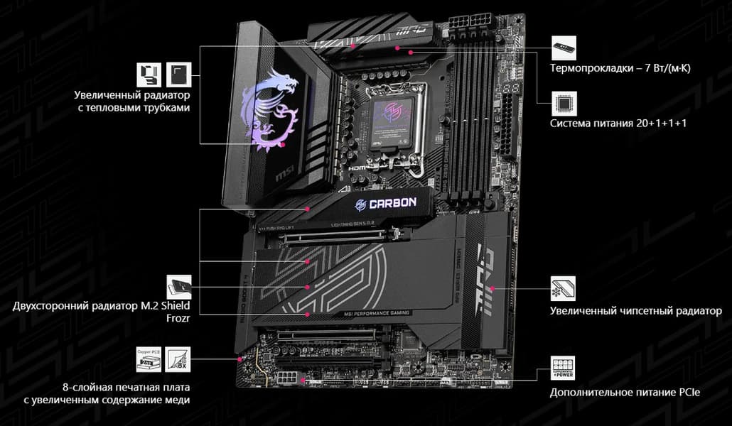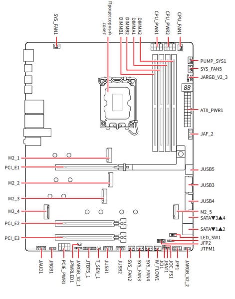 | Прочие внутренние элементы | 24-контактный разъем питания ATX 2 8-контактный разъем питания EPS12V 1 8-контактный разъем питания PCIe 1 слот M.2 (E-key), занят адаптером беспроводных сетей 1 разъем для подключения порта USB 3.2 Gen2x2 Type-C 2 разъема для подключения 4 портов USB 3.2 Gen1 2 разъема для подключения 4 портов USB 2.0 7 разъемов для подключения 4-контактных вентиляторов и помп ЖСО 3 разъема для подключения адресуемой ARGB-ленты 1 разъем для подключения неадресуемой RGB-ленты 1 разъем аудио для передней панели корпуса 1 переключатель подсветки LED_SW 1 разъем для термодатчиков 1 переключатель JOC_FS для загрузки со сниженными параметрами CPU 1 разъем для подключение дискретных карт Thunderbolt5 1 разъем для подключение систем безопасности TPM 1 разъем для подключения управления с передней панели корпуса 1 разъем для подключение проприетарных систем охлаждения от MSI 1 разъем WFLOW для контроля потока жидкости в кастомных СЖО |