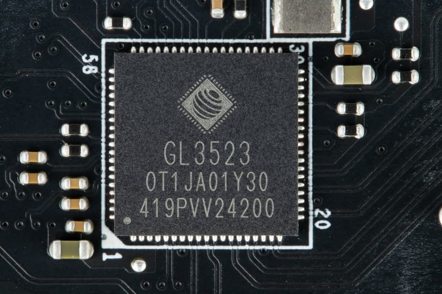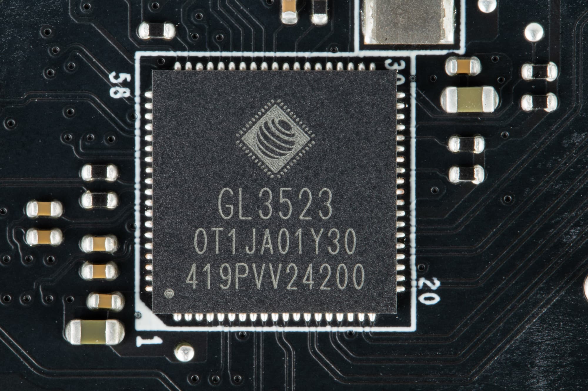- 4 порта USB 3.2 Gen1: все реализованы через контроллер Genesys Logic GL3523 (он расположен на оборотной стороне платы, и на него потрачена 1 линия USB 3.2 Gen1 от Z890) и представлены 2 внутренними разъемами на материнской плате (каждый на 2 порта);