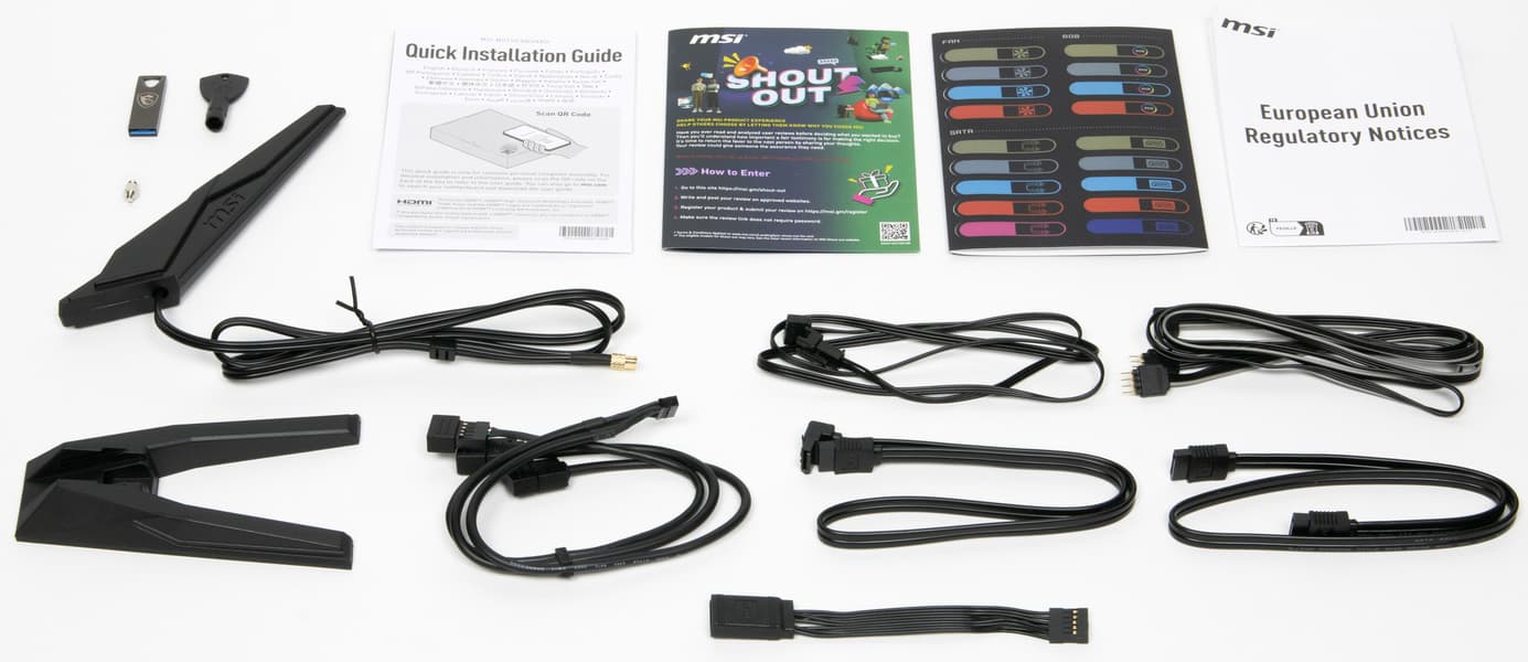 Надо отметить, что комплект поставки неплох: кроме традиционных элементов типа краткого руководства пользователя и кабелей SATA, имеются антенна встроенного Wi-Fi-модуля, фирменный адаптер для передней панели, бонусные стикеры, ключ для смены держателей в слотах M.2, адаптеры для подключения внешней подсветки, адаптер для подключения СО от MSI через проприетарное гнездо JAF и накопитель типа Flash-drive с ПО.