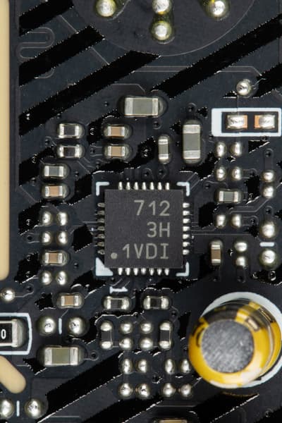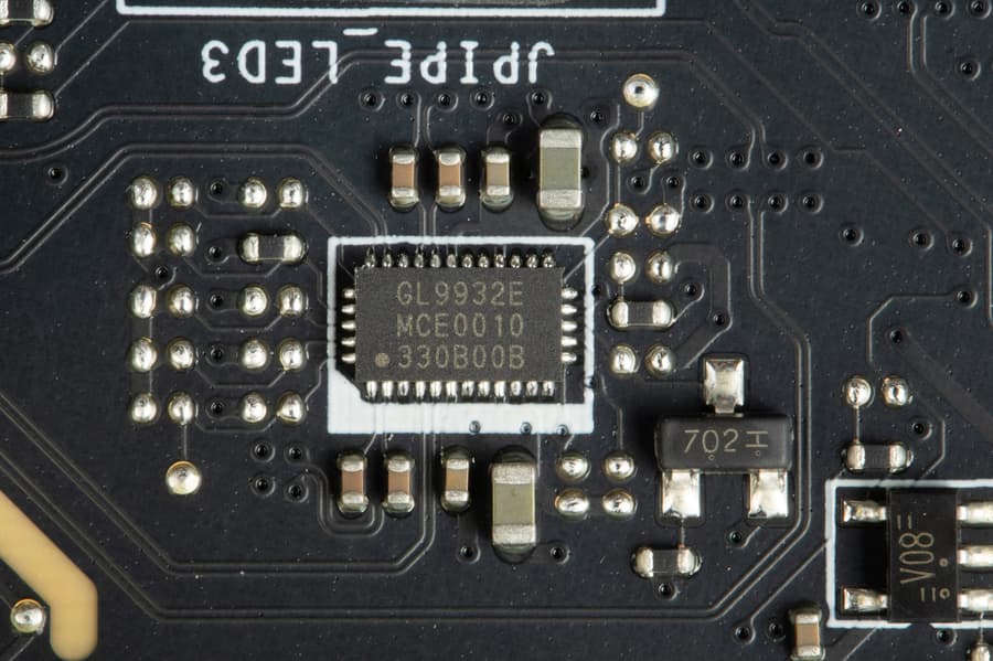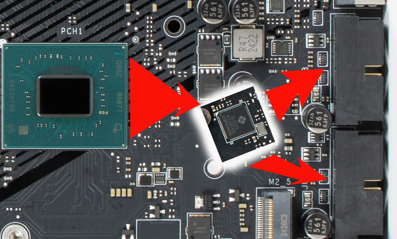 Для более стабильной работы на матплате имеются усилители (ре-драйверы) сигнала PCIe 4.0 от Genesys Logic.