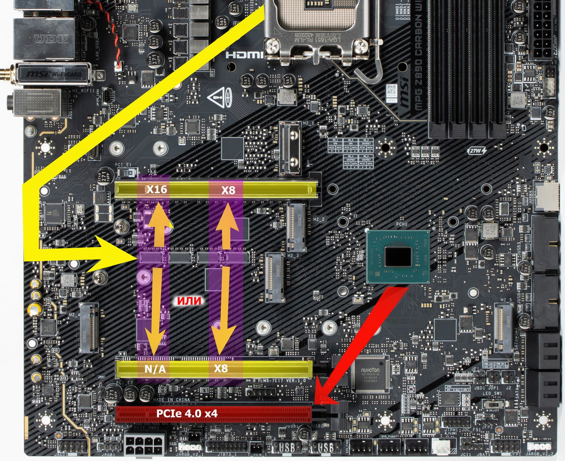 - 8 линий + 4 линии + 4 линии + 4 линии (слот PCIe x16 в режиме x8 + 3 слота M.2);