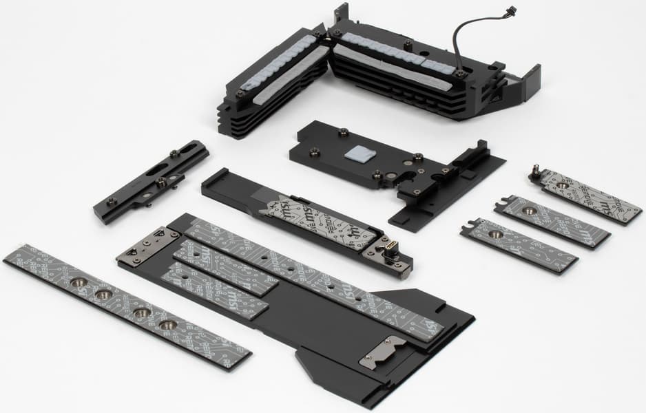 Все M.2 слоты имеют радиаторы. Верхний M.2_1 обладает отдельным радиатором, когда как остальные все слоты M.2 имеют общий радиатор. Также все слоты M.2 кроме верхних радиаторов еще имеют радиаторы для охлаждения тыльной стороны модулей.