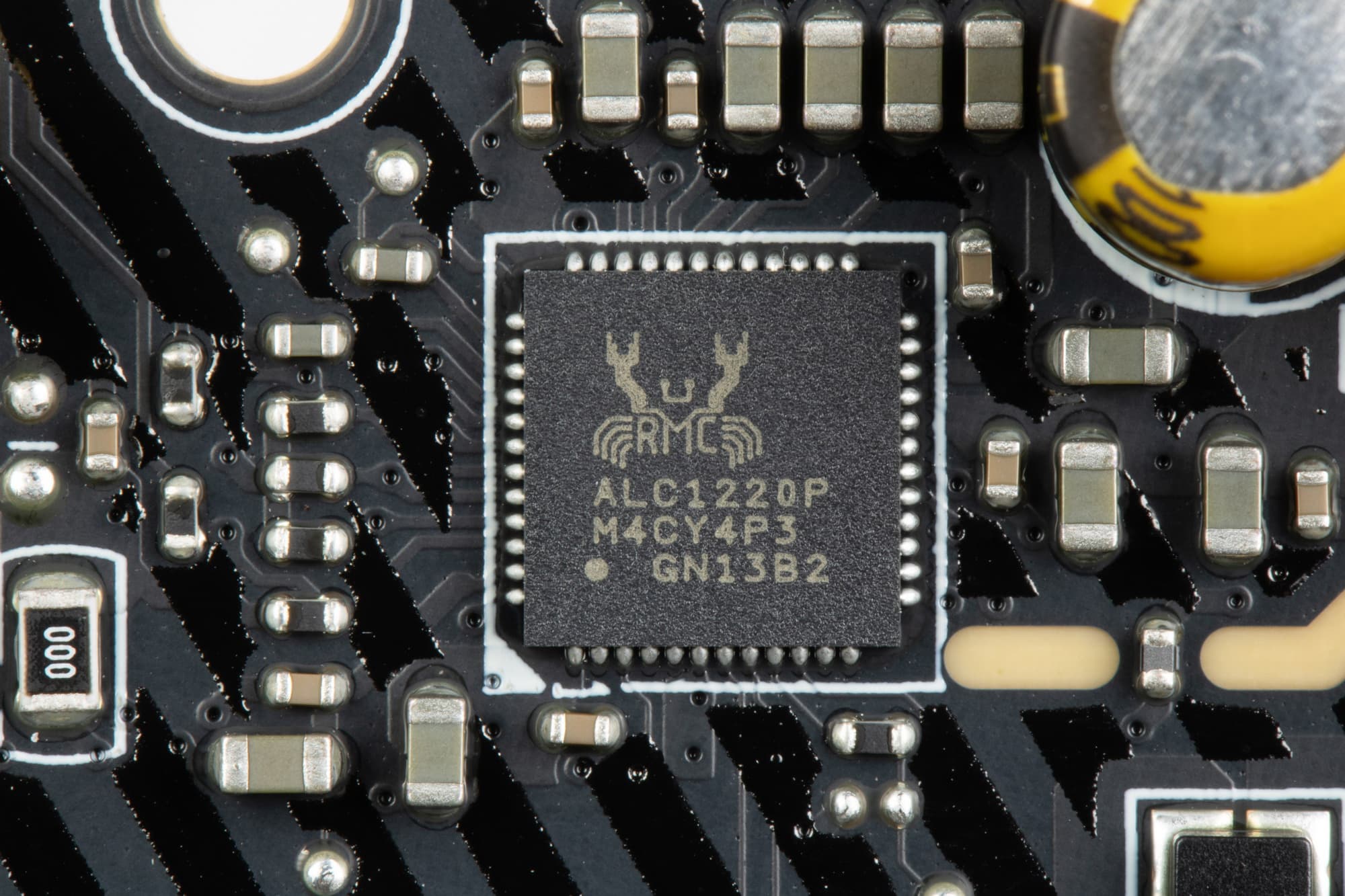 В данном случае плата оснащена аудиоподсистемой, где звуком заведует аудиокодек Realtek ALC1220, он целом обеспечивает вывод звука по схемам до 7.1 с разрешением до 24 бит /192 кГц. Не забываем, что для работы такого кодека требуются сигнальные линии USB 2.0 (протокол HDA «Азалия» убран из новой платформы).