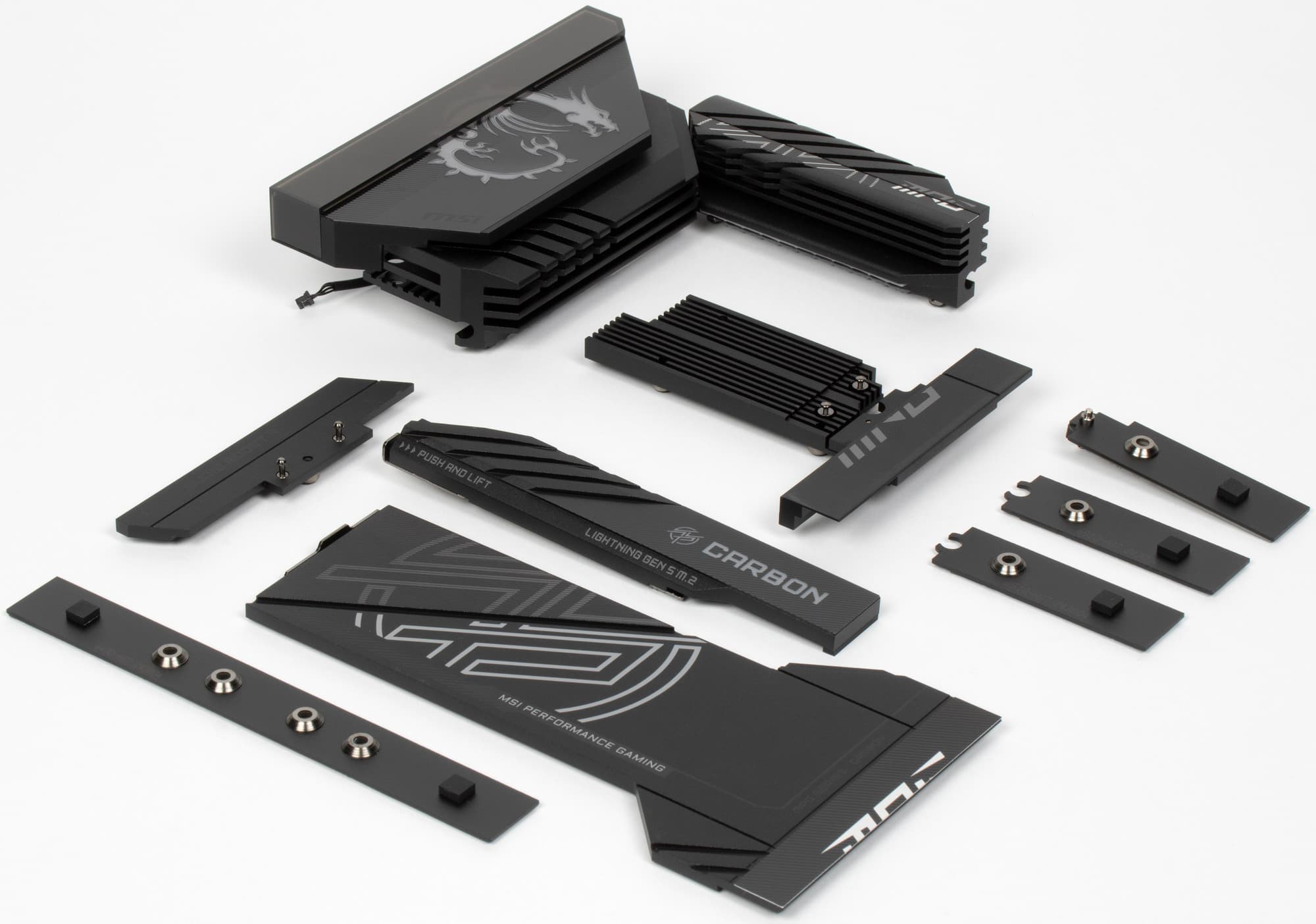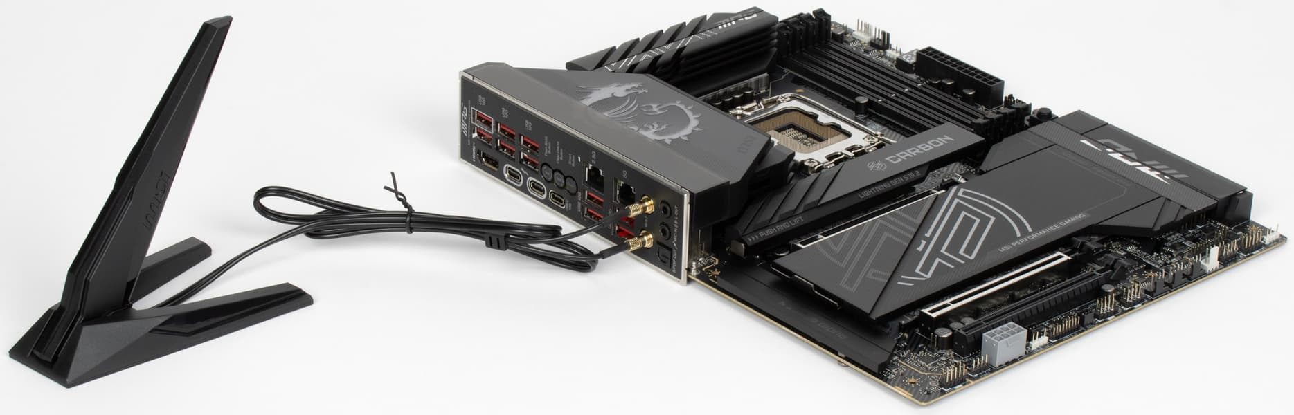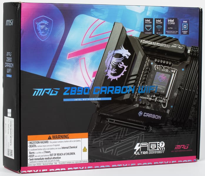 MSI MPG Z890 Carbon WiFi поставляется в традиционной коробке фирменного дизайна серии MPG. Комплект размещен под платой в отдельных отсеках.