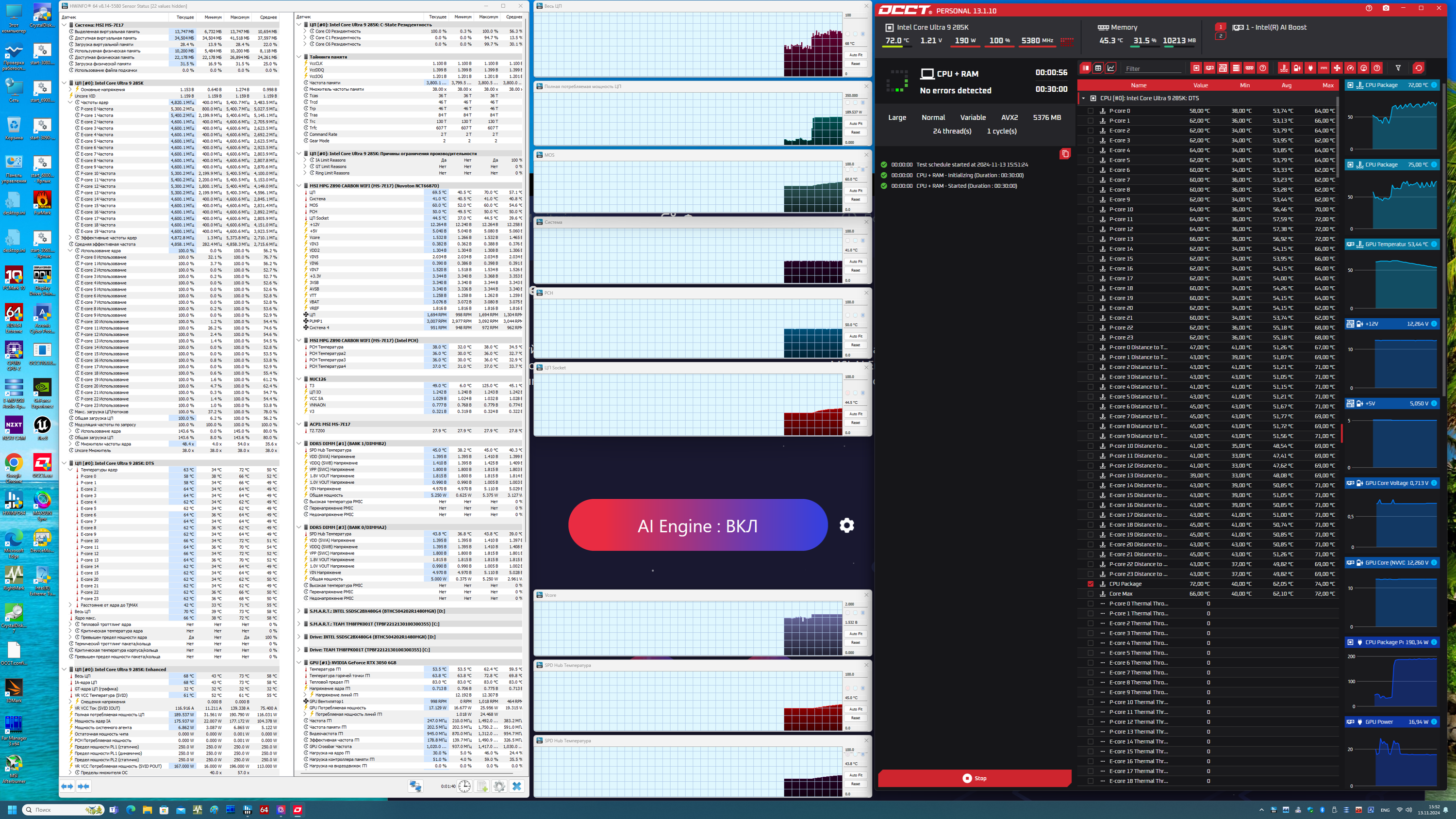 Хахаха! Мы получили те же частоты работы, но потребление процессора выросло еще на 4-5 Вт, и производительность приросла на пару процентов. Ну, в целом, ощущение есть того, что все эти автоматические пробы разгона – ерунда, несколько лет назад изменение подобных настроек через BIOS (не считая AI – тогда этого еще не было) давало от 5% прироста производительности. Вероятно ситуация с деградацией процессоров Intel 13xxx/14xxx от избыточного вольтажа привела к тому, что Intel перестраховывается, и без влезания в гущу настроек оверклокинга с переводом всего и вся на ручное управления авторазгон у всех вендоров дает примерно одинаковую производительность, а раскрученные через маркетинг опции сверхразгонов дают лишь считанные проценты приростов.