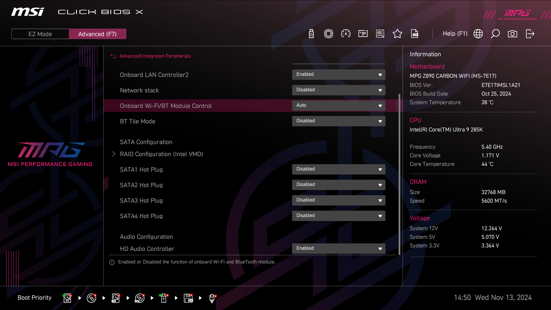 - Intel BE200 WIFI7/BT (Wireless) (1 линия PCIe 4.0);