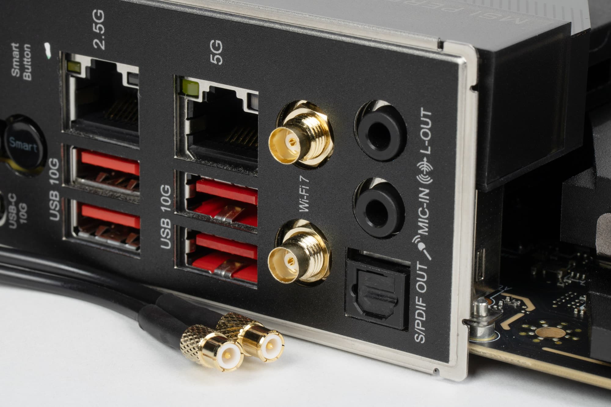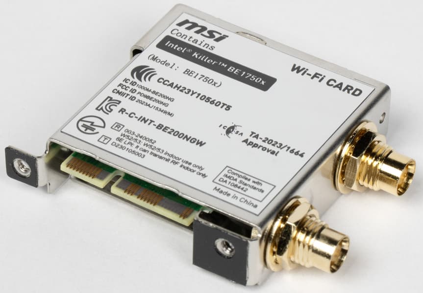 Имеется и комплексный беспроводной адаптер на контроллере Intel BE200, через который реализованы Wi-Fi 7 (802.11a/b/g/n/ac/ax/be, 2,4/5/6 ГГц) и Bluetooth 5.4. Он установлен в слот M.2 (E-key), и его разъемы для выносных антенн выведены на заднюю панель.