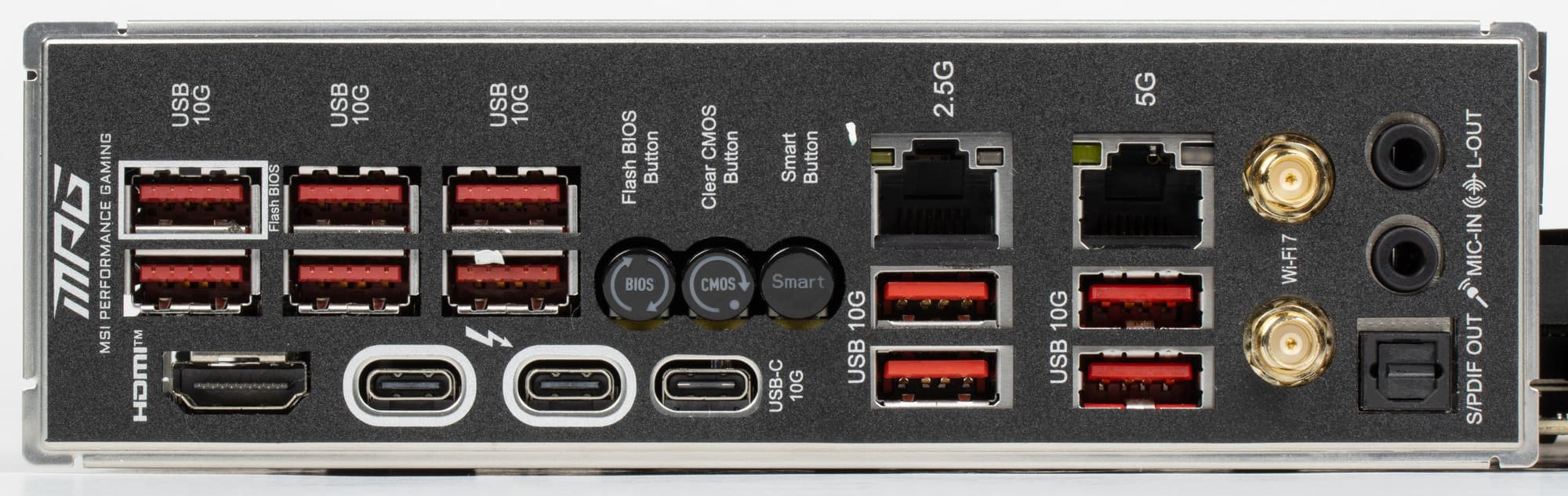 | Разъемы на задней панели | 2 × USB4 (Type-C) 10 × USB 3.2 Gen2 (Type-A) 1 × USB 3.2 Gen2 (Type-C) 2 × RJ-45 2 аудиоразъема типа миниджек 1 × S/PDIF (оптический, выход) 1 × HDMI (выход) 2 антенных разъема многофункциональная кнопка Smart кнопка сброса CMOS кнопка перепрошивки BIOS — Flash BIOS |