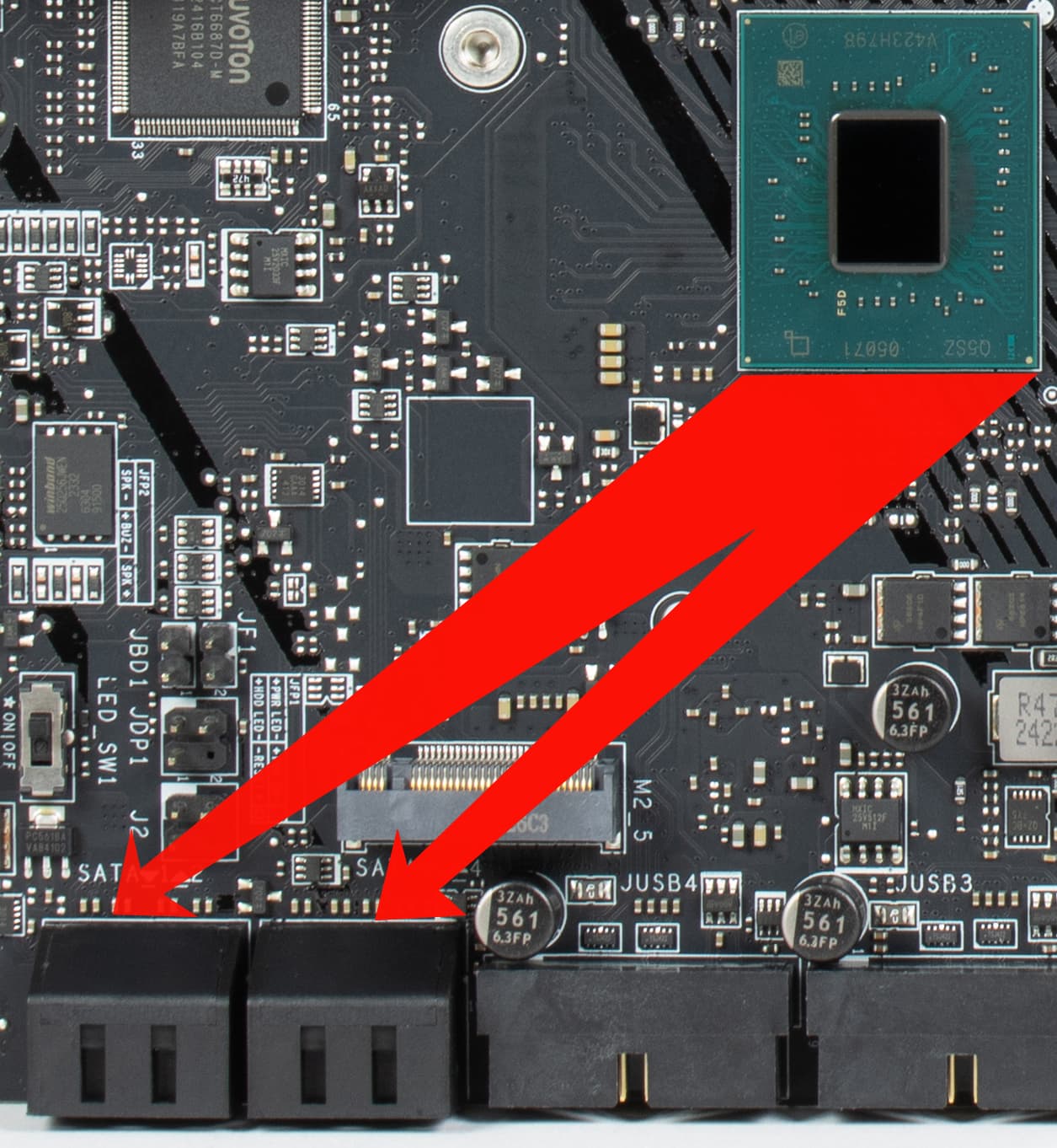 Всего у платы 4 разъема Serial ATA 6 Гбит/с +5 слотов для накопителей в форм-факторе M.2. 4 порта SATA 1,2,3,4 реализованы через чипсет Z890 и поддерживают создание RAID.