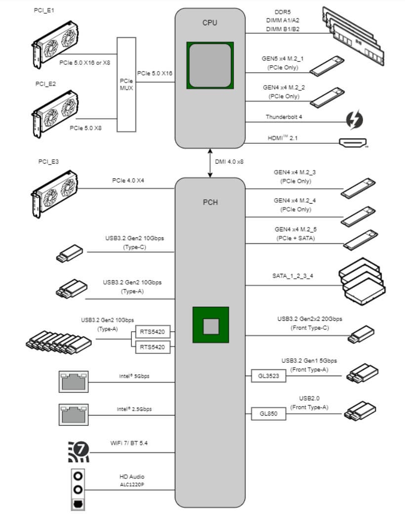 Теперь посмотрим выше на то, как работают процессоры в данной конфигурации. У CPU Core Ultra 2xx всего 24 линии PCIe, из них 4 линии версии PCIe 5.0 отведены на порт М.2 (M.2_1), 4 линии версии PCIe 4.0 отведены на порт М.2 (M.2_2) . Оставшиеся 16 линий PCIe 5.0 надо делить на два слота PCIe x16 (PCI_E1, PCI_E2). Вариантов переключения несколько: