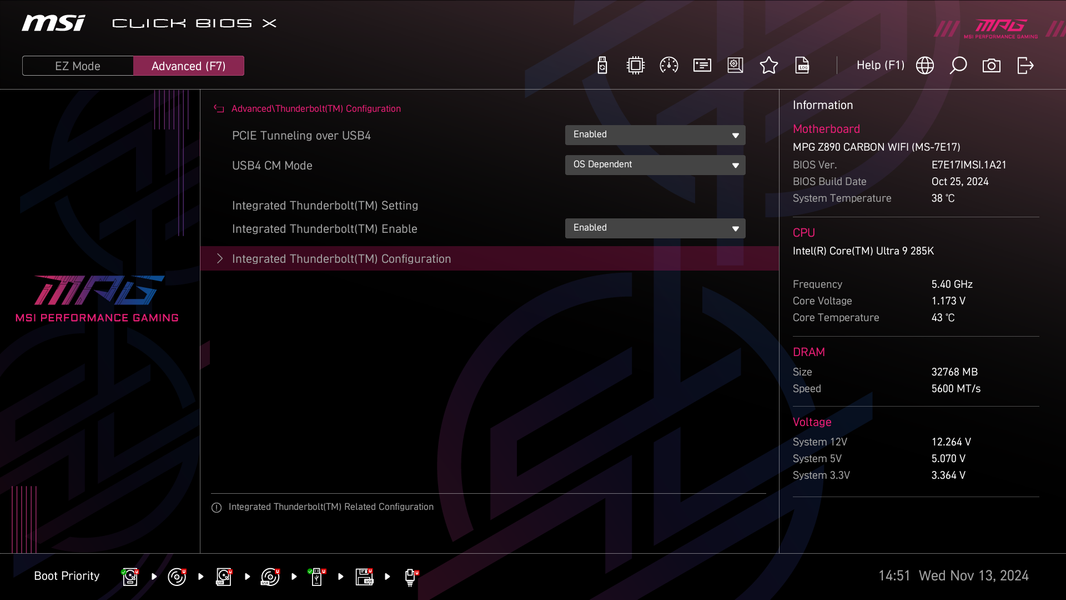 Следует обратить особое внимание на поддержку USB4, которая на платформе Intel LGA1851 реализована через Thunderbolt 4, аппаратно встроенный в CPU.