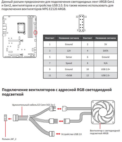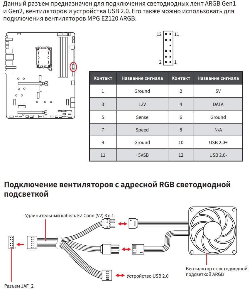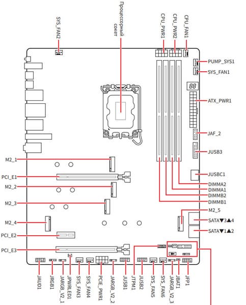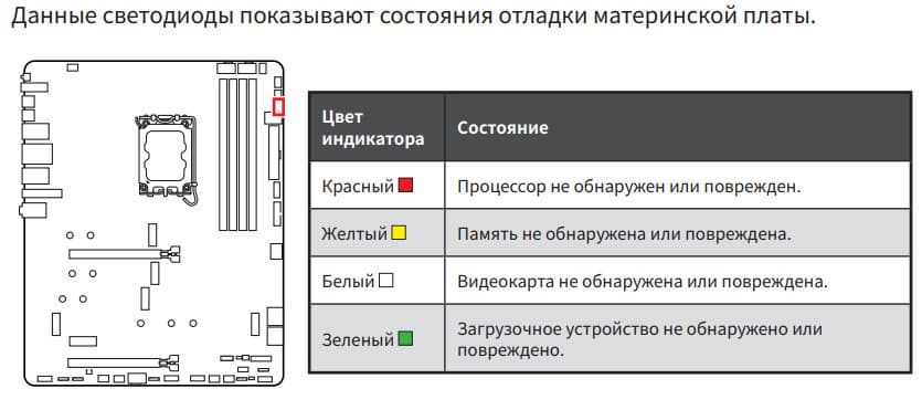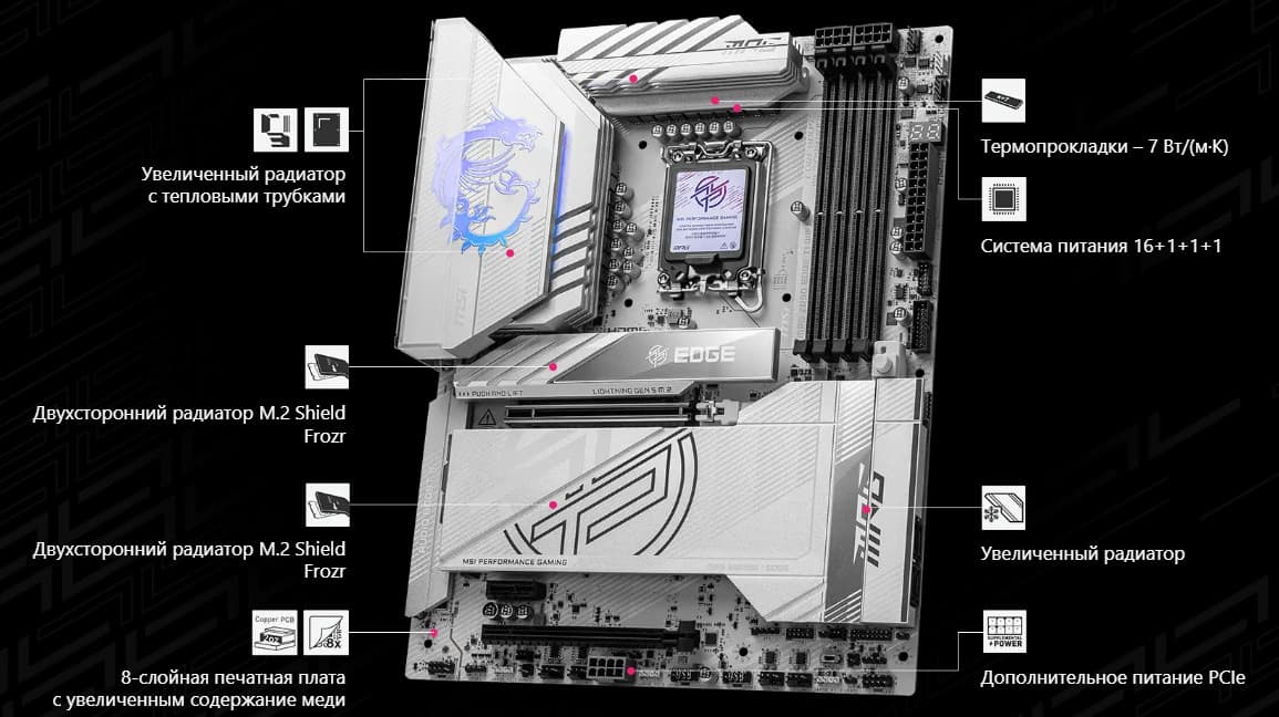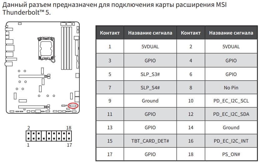 | Прочие внутренние элементы | 24-контактный разъем питания ATX 2 8-контактный разъем питания EPS12V 1 8-контактный разъем питания PCIe 1 слот M.2 (E-key), занят адаптером беспроводных сетей 1 разъем для подключения порта USB 3.2 Gen2x2 Type-C 1 разъем для подключения 2 портов USB 3.2 Gen1 2 разъема для подключения 4 портов USB 2.0 8 разъемов для подключения 4-контактных вентиляторов и помп ЖСО 3 разъема для подключения адресуемой ARGB-ленты 1 разъем для подключения неадресуемой RGB-ленты 1 разъем аудио для передней панели корпуса 1 переключатель подсветки LED_SW 1 переключатель сброса CMOS 1 разъем для термодатчика 1 разъем JDASH для подключение контроллера настройки (приобретается отдельно) 1 разъем для подключение дискретных карт Thunderbolt5 1 разъем для подключение систем безопасности TPM 2 разъема для подключения управления с передней панели корпуса 1 разъем для подключение проприетарных систем охлаждения от MSI |