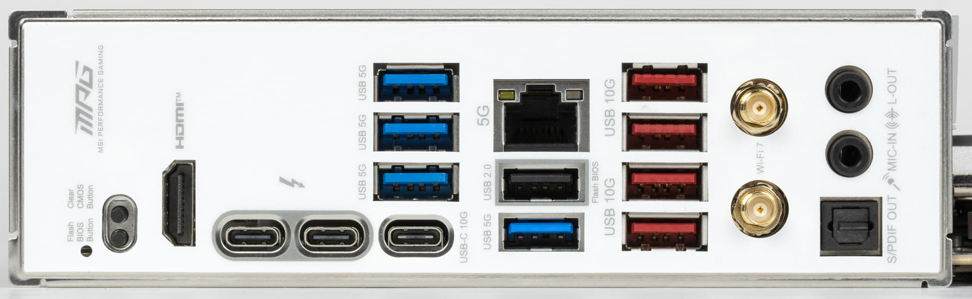 | Разъемы на задней панели | 2 × USB4 (Type-C) 4 × USB 3.2 Gen2 (Type-A) 4 × USB 3.2 Gen1 (Type-A) 1 × USB 3.2 Gen2 (Type-C) 1 × RJ-45 2 аудиоразъема типа миниджек 1 × S/PDIF (оптический, выход) 1 × HDMI (выход) 2 антенных разъема кнопка сброса CMOS кнопка перепрошивки BIOS — Flash BIOS |