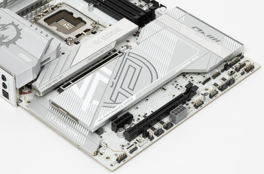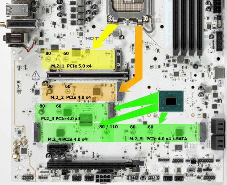 Третий, четвертый и пятый слоты M.2 (M.2_3, M.2_5) получают данные от чипсета Z890, а первые два — от CPU, при этом M.2_1 получает PCIe 5.0, а M.2_2 получает от процессора PCIe 4.0.