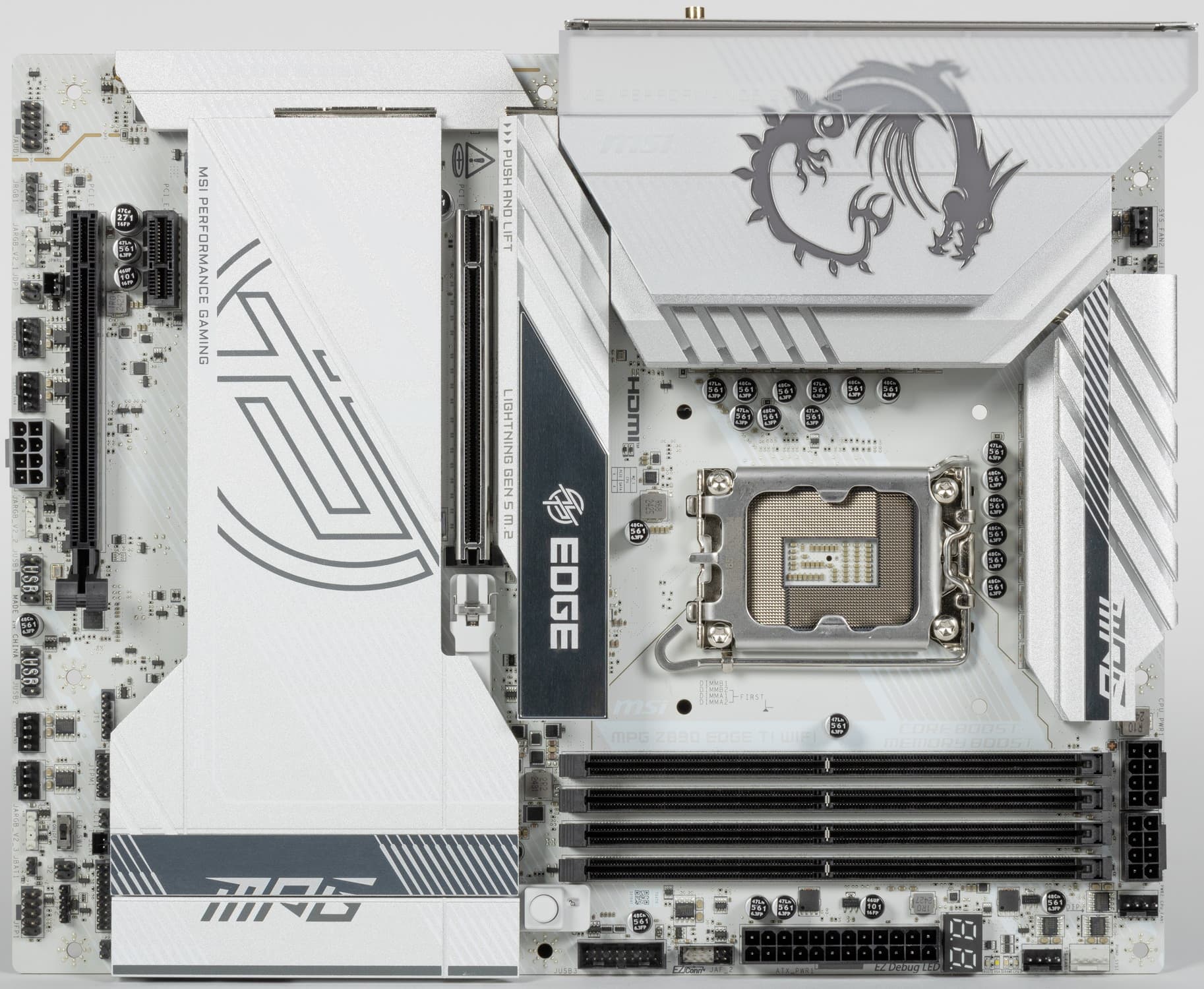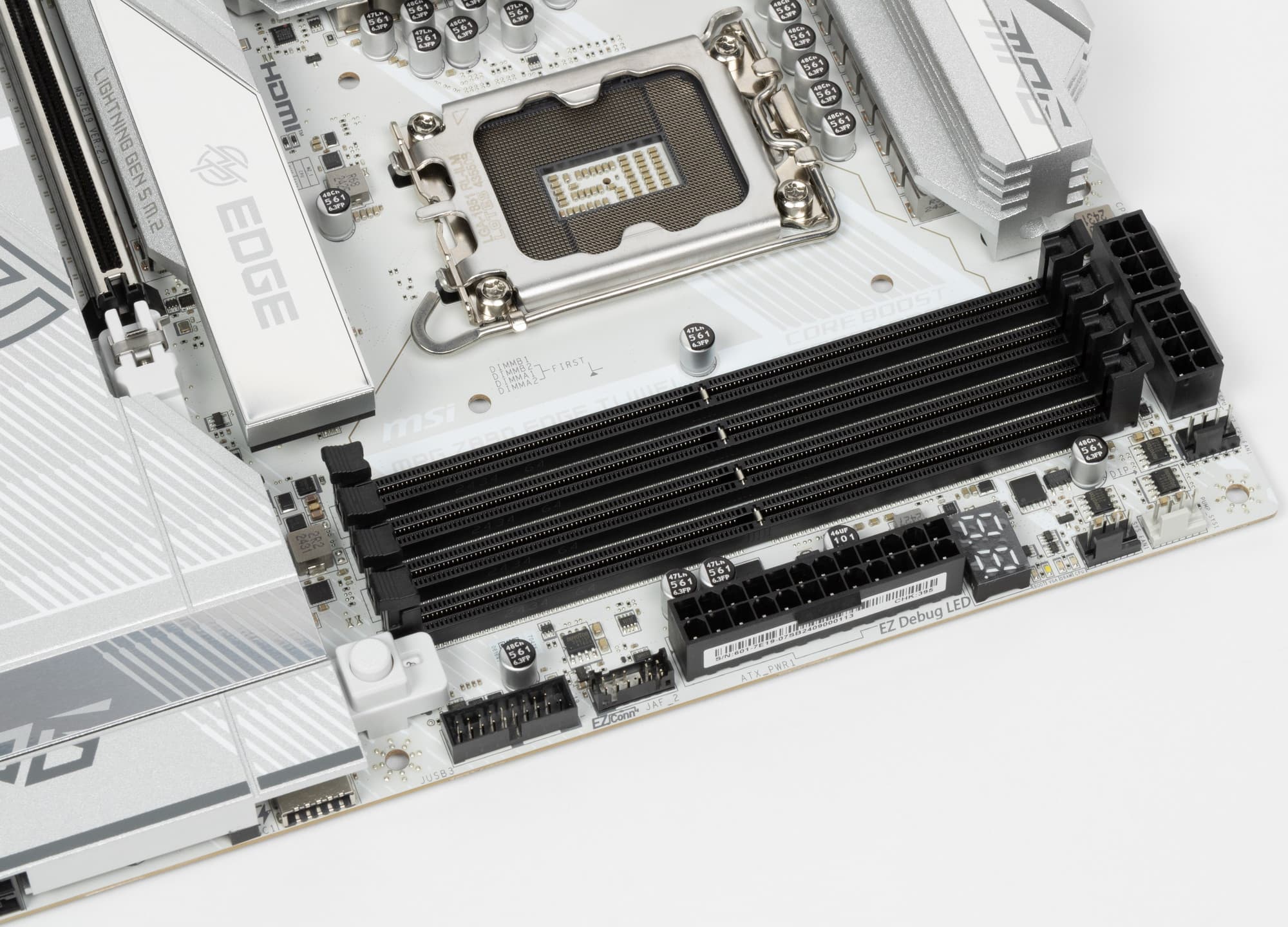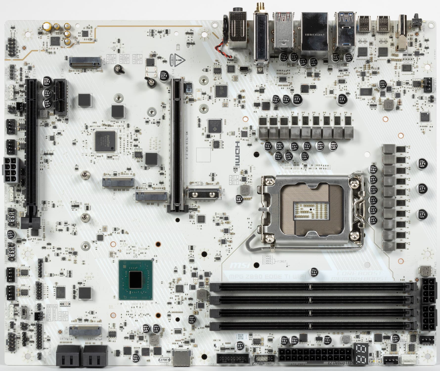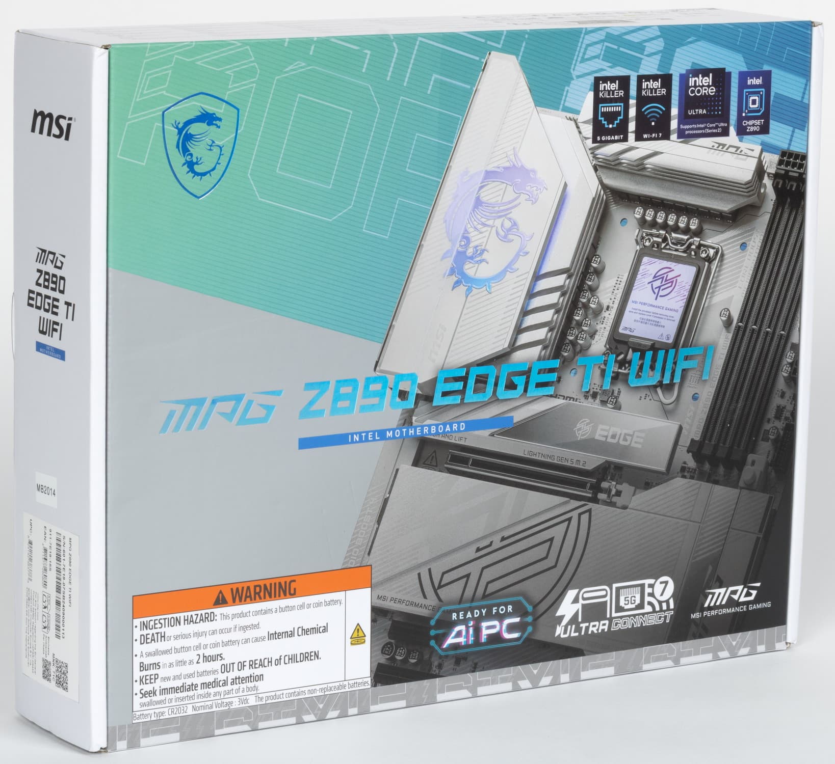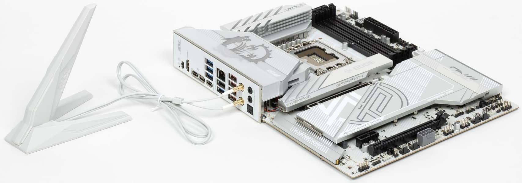 MSI MPG Z890 Edge Ti WiFi поставляется в коробке относительно нового светлого дизайна MSI. Комплект размещен под платой в отдельном отсеке.