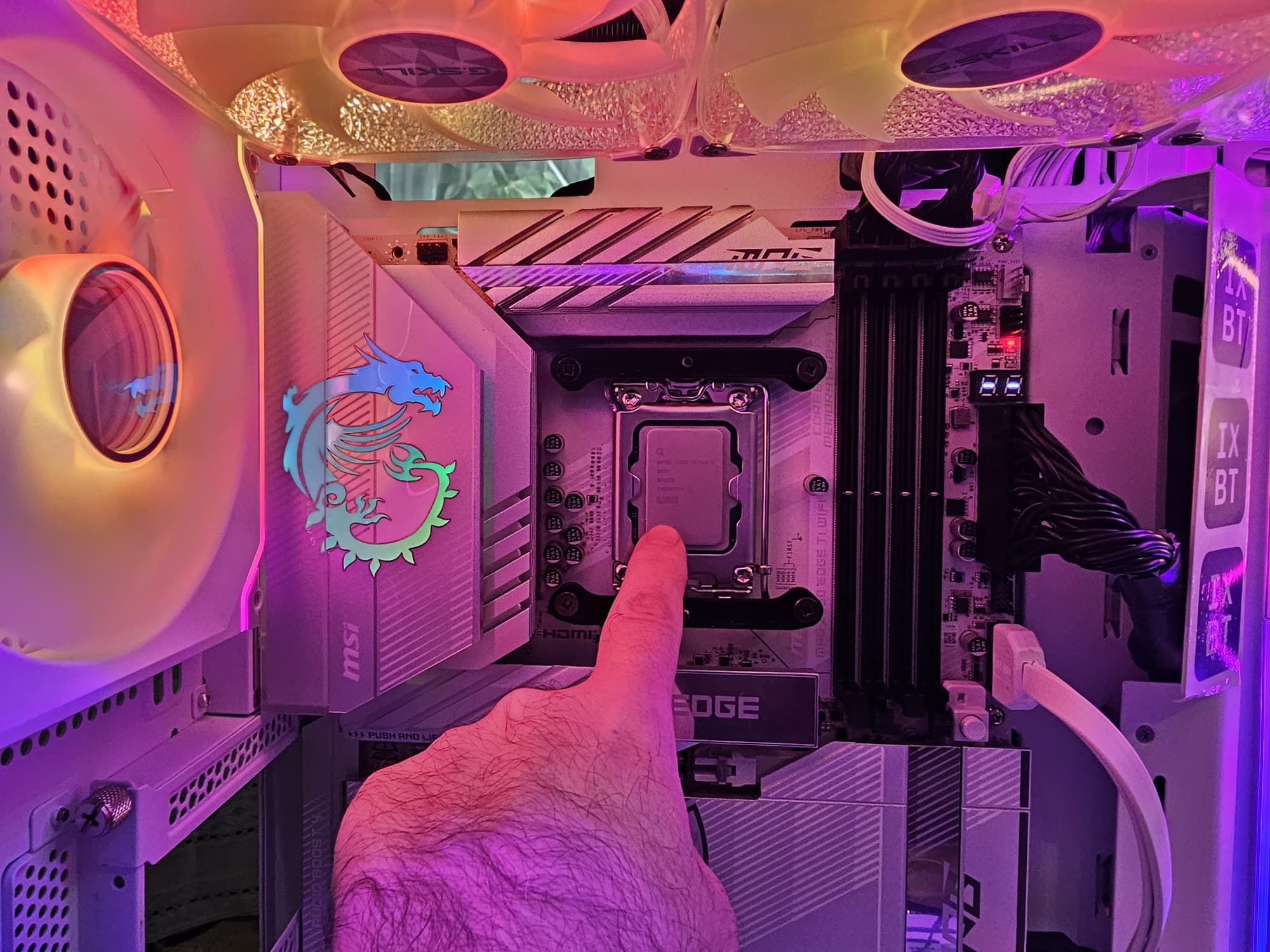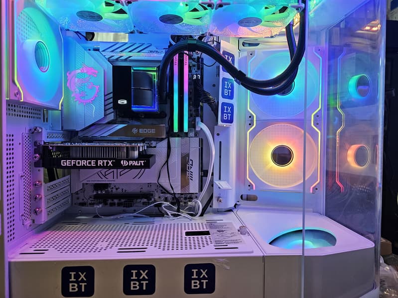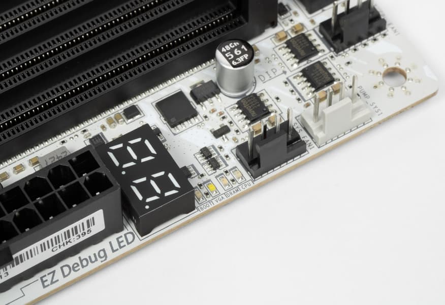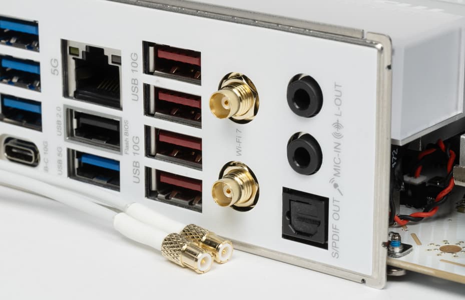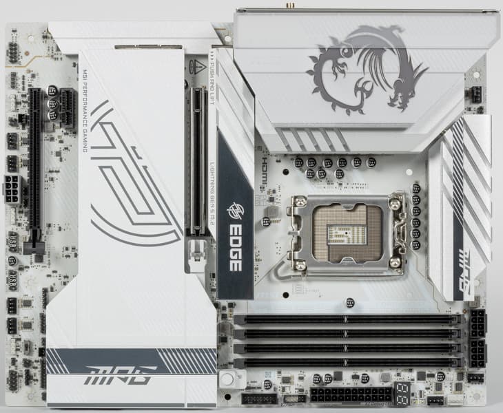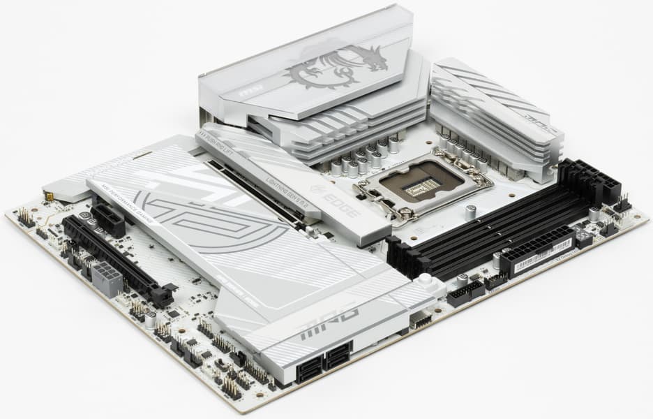 В арсенале платы также есть 4 порта SATA и 8 разъемов для вентиляторов. Система питания процессора относительно мощная, способная обеспечить работу любых совместимых процессоров с приличным и уже традиционным запасом на разгон. Плата имеет грамотную систему охлаждения каждого потенциально греющегося элемента, включая накопители в слотах M.2. Сетевые возможности включают скоростной проводной контроллер 5 Гбит/с и один самый современный беспроводной — Wi-Fi 7 + Bluetooth 5.4. В числе плюсов платы можно упомянуть широкие возможности для подключения дополнительных RGB-устройств, а также красивый белый дизайн.