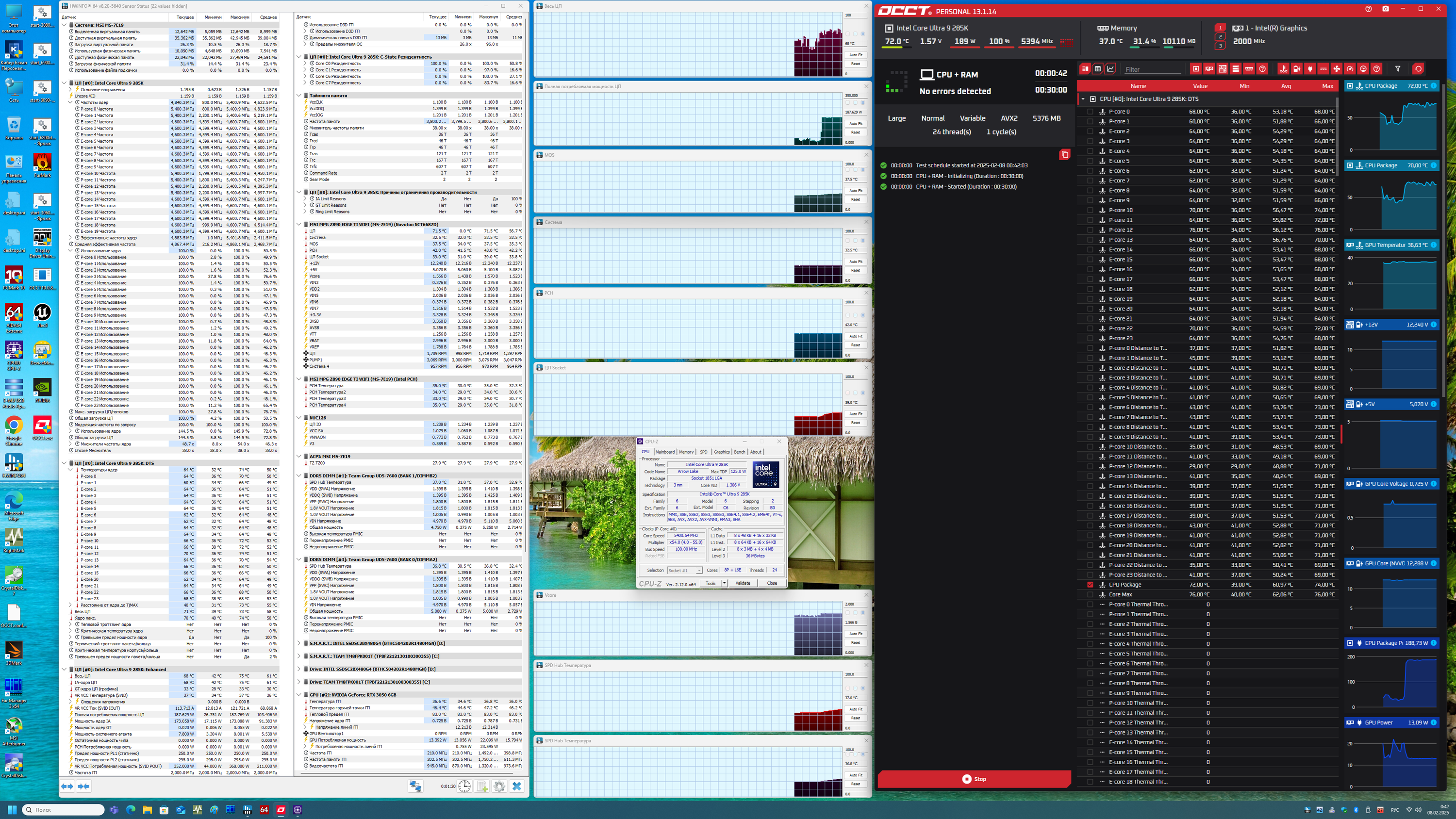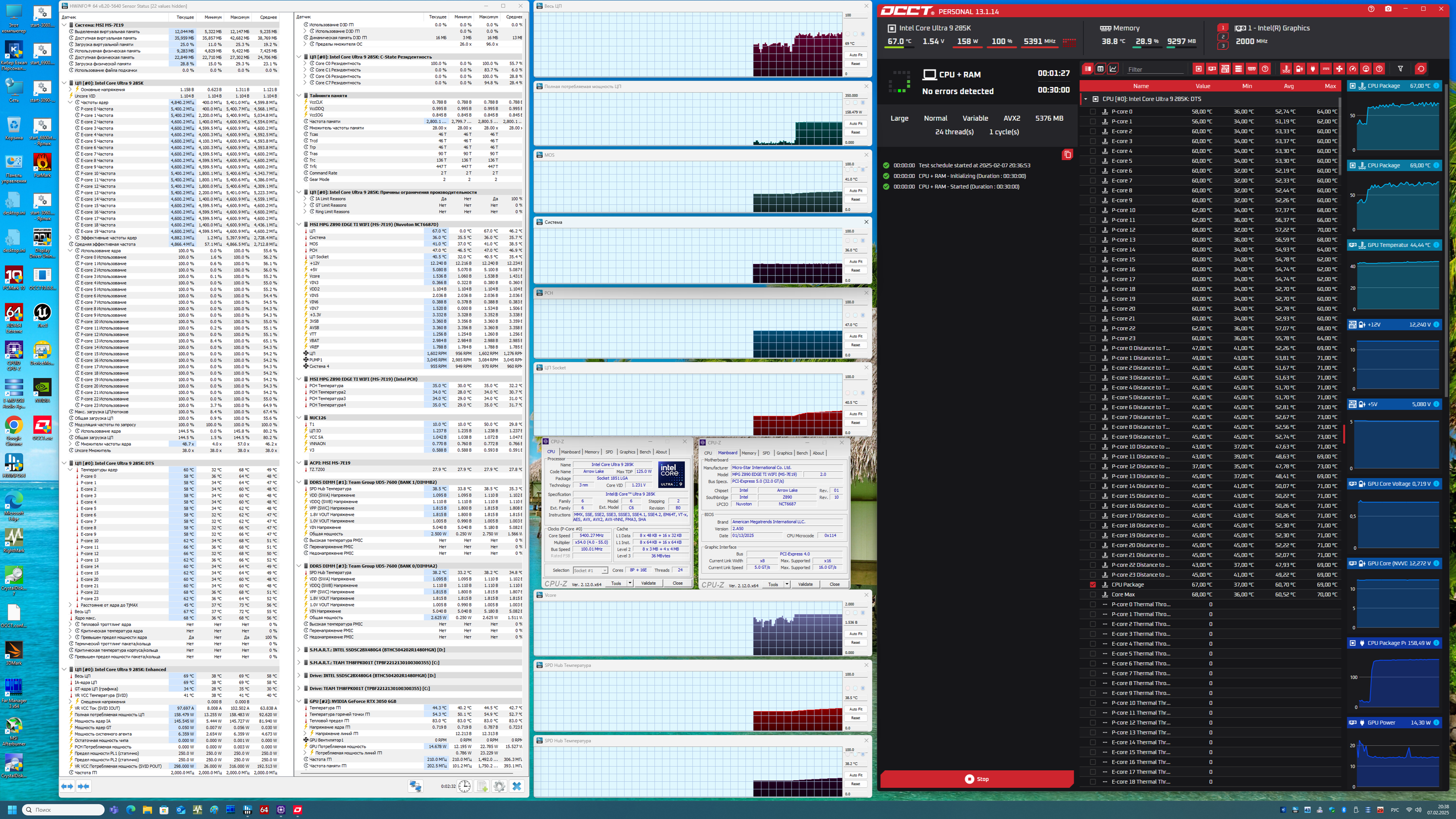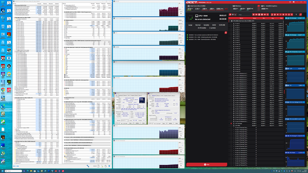 В режиме авторазгона мы получили до 5,4 ГГц по P-ядрам, и 4.6 ГГц по всем Е-ядрам. Напомню, что начиная с этого поколения процессоров, все ядра имеют по 1 потоку, то есть гипертрейдинга (многопоточности) теперь нет. Потребление процессора достигало 158 Вт, что меня удивило, ведь обычно потребление такого процессора достигало 200 и более Вт. Безусловно, процессор достиг максимумов по частотам, что установлено Intel для каждого процессора, однако частоты не фиксированные, а весьма сильно «прыгали» (MCE теперь по умолчанию отключен). Однако раз данный режим работы стоит по умолчанию, что уже означает, что львиная доля пользователей его и будет использовать, а значит следует брать его как базис. Но при этом на других матплатах на базе Z890, также в режиме по умолчанию, заданном Intel, мы видели потребление процессора Core Ultra 285K выше, чем тут. Понятно, что многое зависит от системы питания, как я уже говорил не раз. Все ШИМ-контроллеры программируемые, вся информация о них – в UEFI BIOS, откуда и приходят режимы работы CPU в том или ином случае. Удивительно другое: на реальной производительности в каких-либо задачах все это не особо сказывается: потребляет процессор 160 или 180 Вт – вы получите разницу в производительности не более 1,5%, что в рамках погрешности измерений. Разумеется, следует учитывать, что мы выводы делаем на основе стресс-теста, а таких режимов работы CPU в обычных массовых задачах не бывает. Даже программы моделирования, рендеринга и т.п. сейчас процессорные мощности используют не полностью (много оптимизаций, которые возлагают часть вычислений на ту же видеокарту).