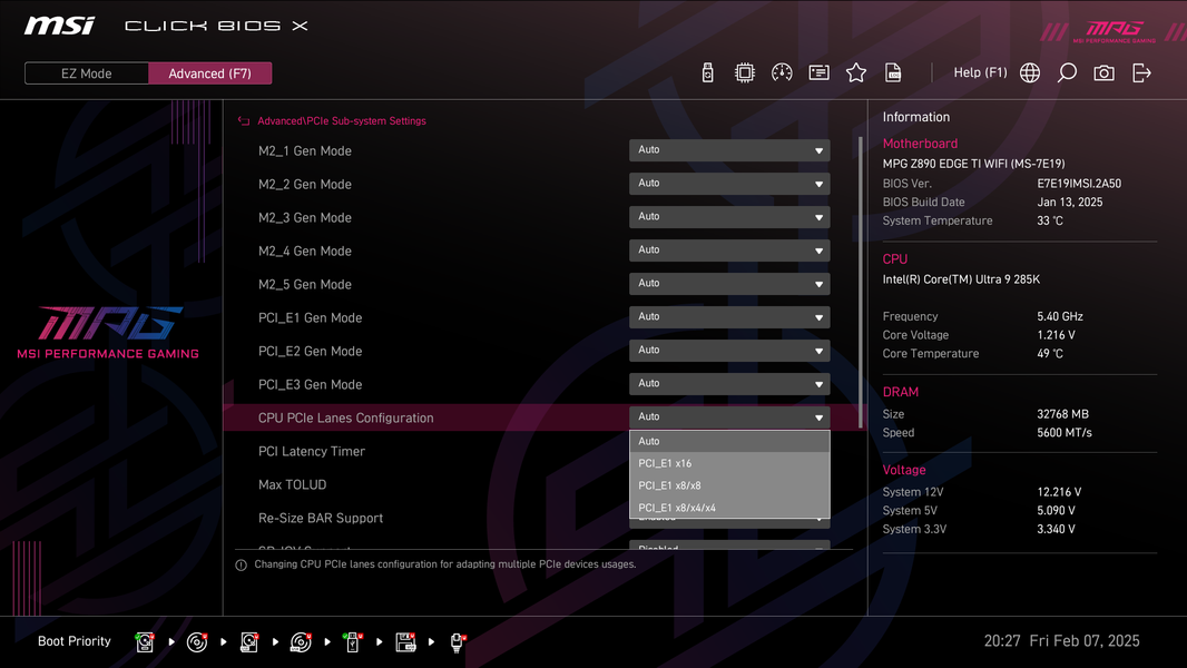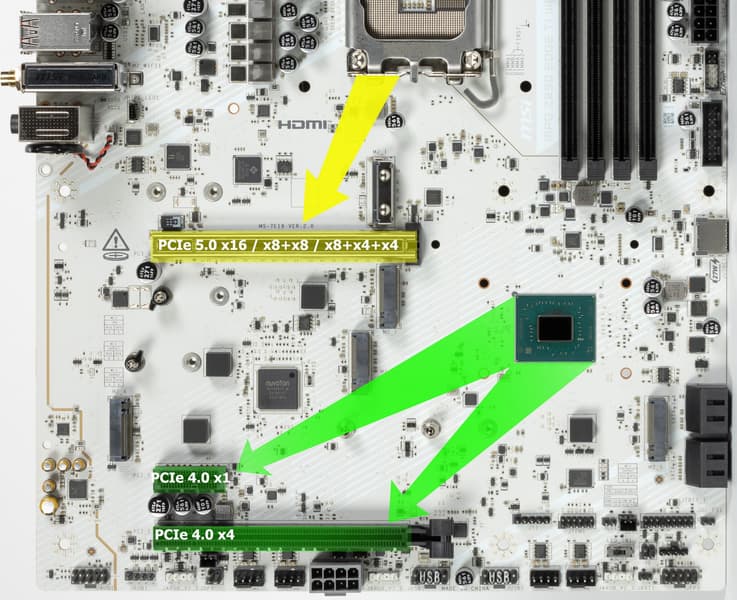 Теперь посмотрим выше на то, как работают процессоры в данной конфигурации. У CPU Core Ultra 2xx всего 24 линии PCIe, из них 4 линии версии PCIe 5.0 отведены на порт М.2 (M.2_1), 4 линии версии PCIe 4.0 отведены на порт М.2 (M.2_2) . Оставшиеся 16 линий PCIe 5.0 идут на слот PCIe x16_1 (PCI_E1. Так что вариантов переключения линий PCIe 5.0 между слотами нет (имеется только возможность на первом слоте задать конфигурацию 16 линий: x16, x8+x8, x8+x4+x4, это на случай установки в данный слот карты расширения с портами M.2).