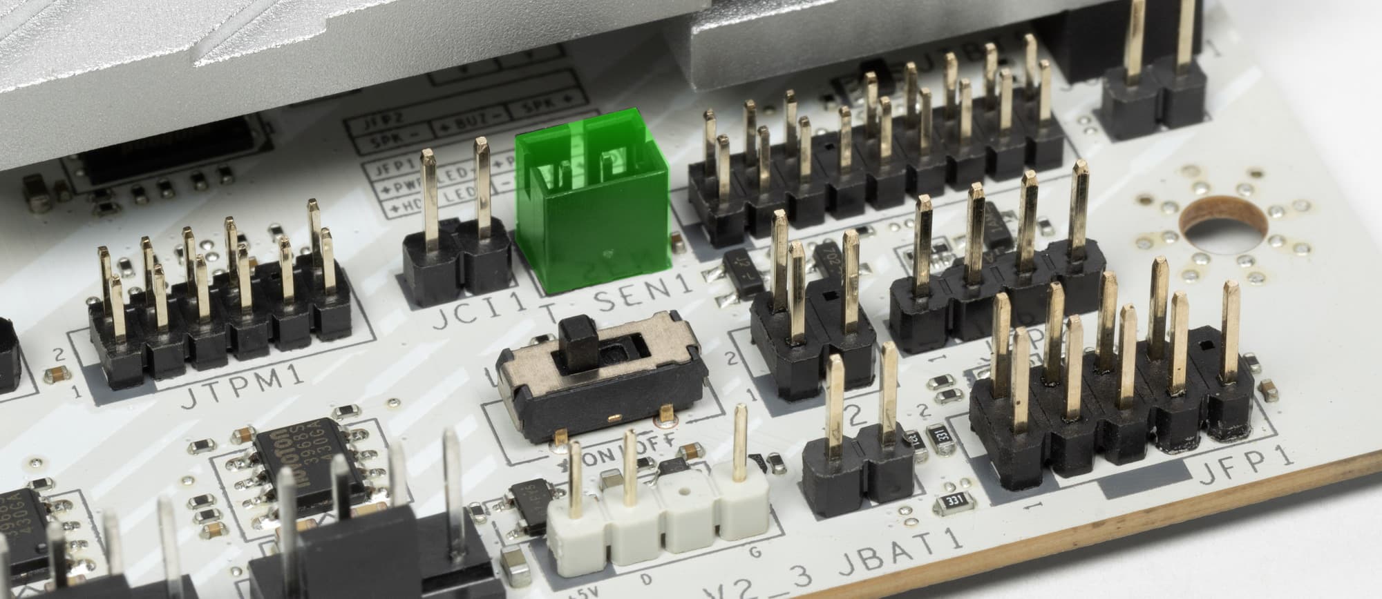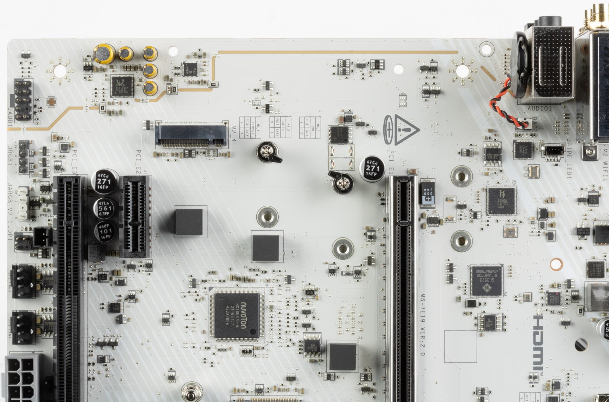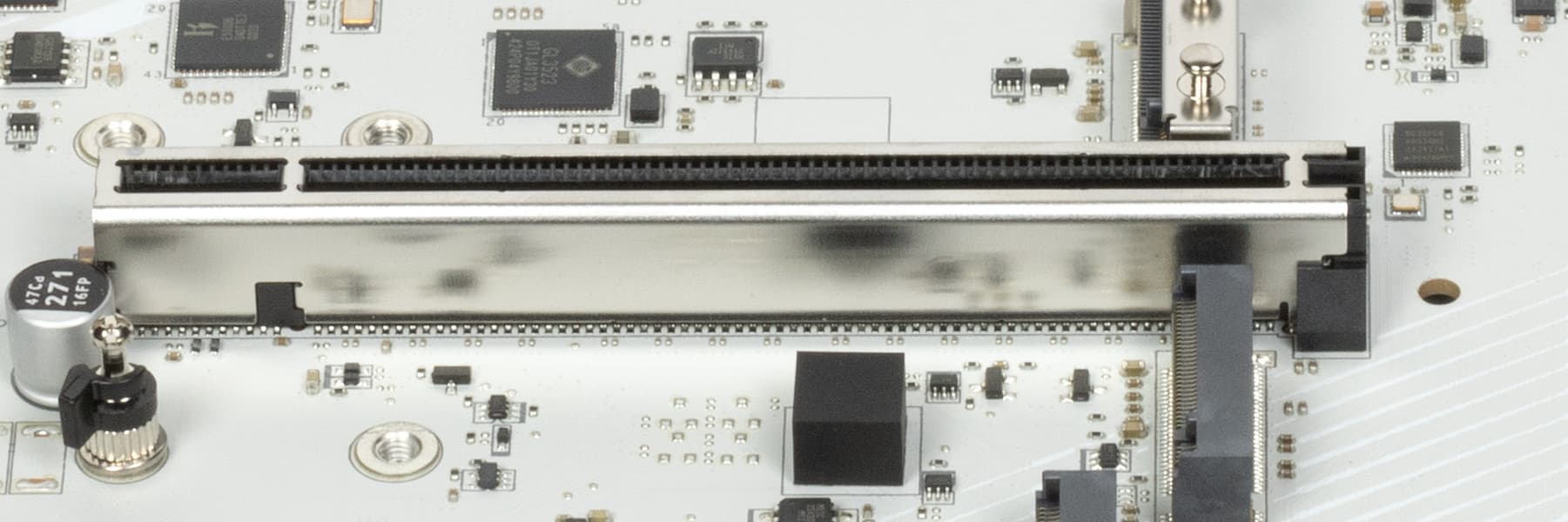 Всего на плате есть 3 слота: слот PCIe x16 (PCI_E1 для видеокарт или других устройств), слот PCIe x1 (PCI_E2) и третий «длинный» PCIe x16 (PCI_E3, но фактически имеющий 4 линии PCIe 4.0).