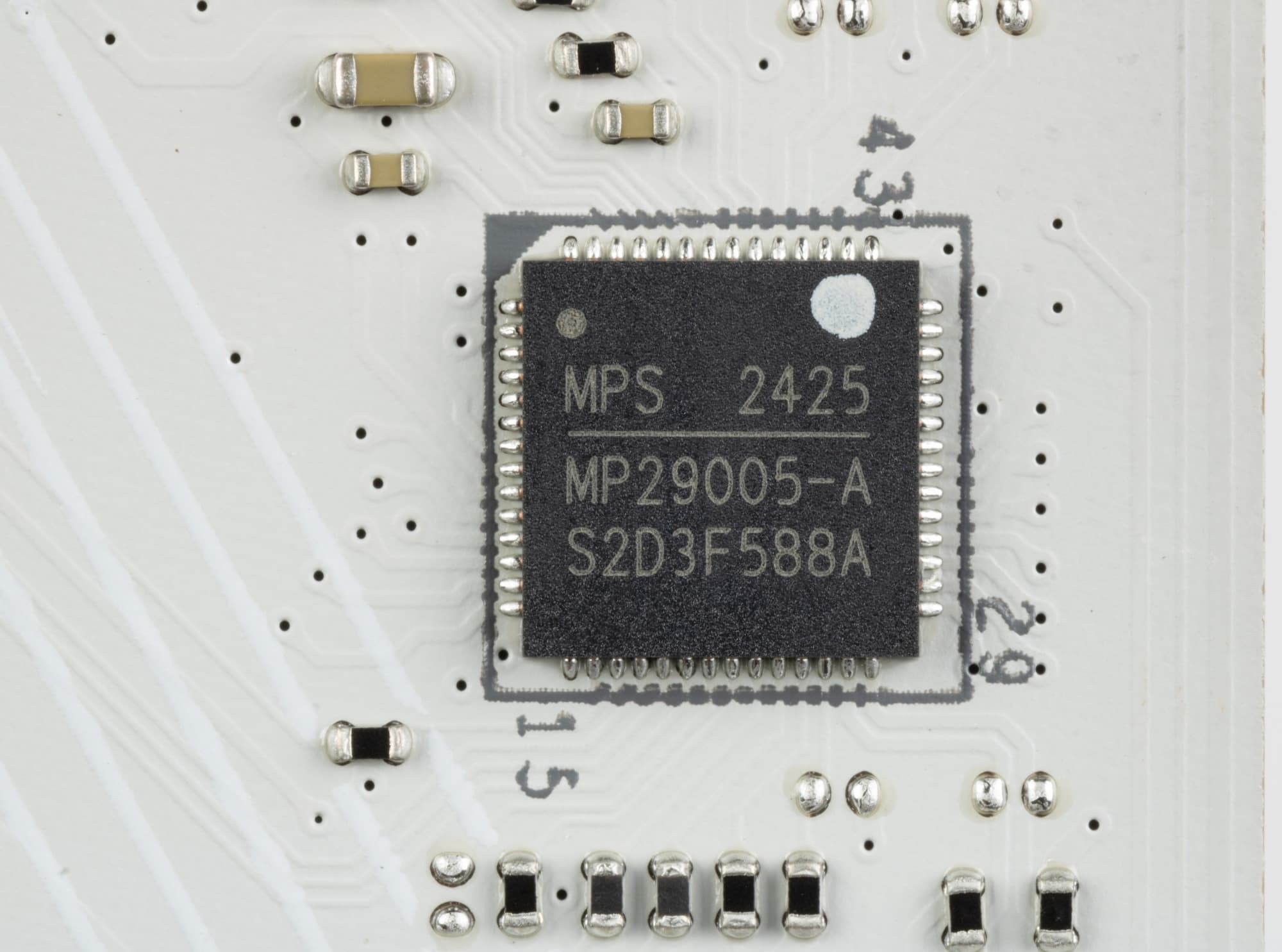 Управление этой схемой возложено на ШИМ-контроллер MP29005 от MPS (он поддерживает до 8х фаз, поэтому у нас идет параллельная схема управления фазами – 2x8).