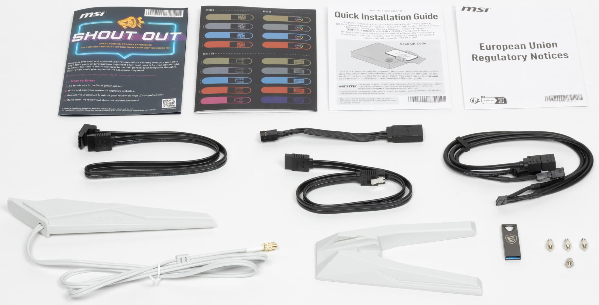 В комплект поставки кроме традиционных элементов типа краткого руководства пользователя и кабелей SATA входят: антенна встроенного Wi-Fi-модуля, фирменный адаптер для передней панели, бонусные стикеры, ключ для смены держателей в слотах M.2, адаптер для подключения СО от MSI через проприетарное гнездо JAF и накопитель типа Flash-drive с ПО.