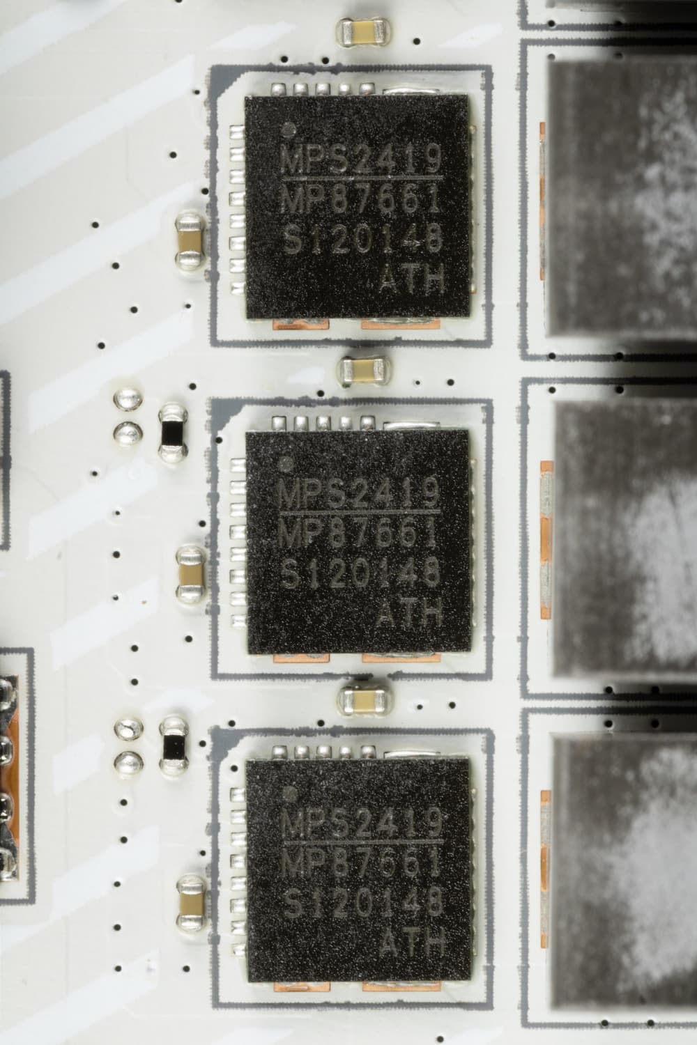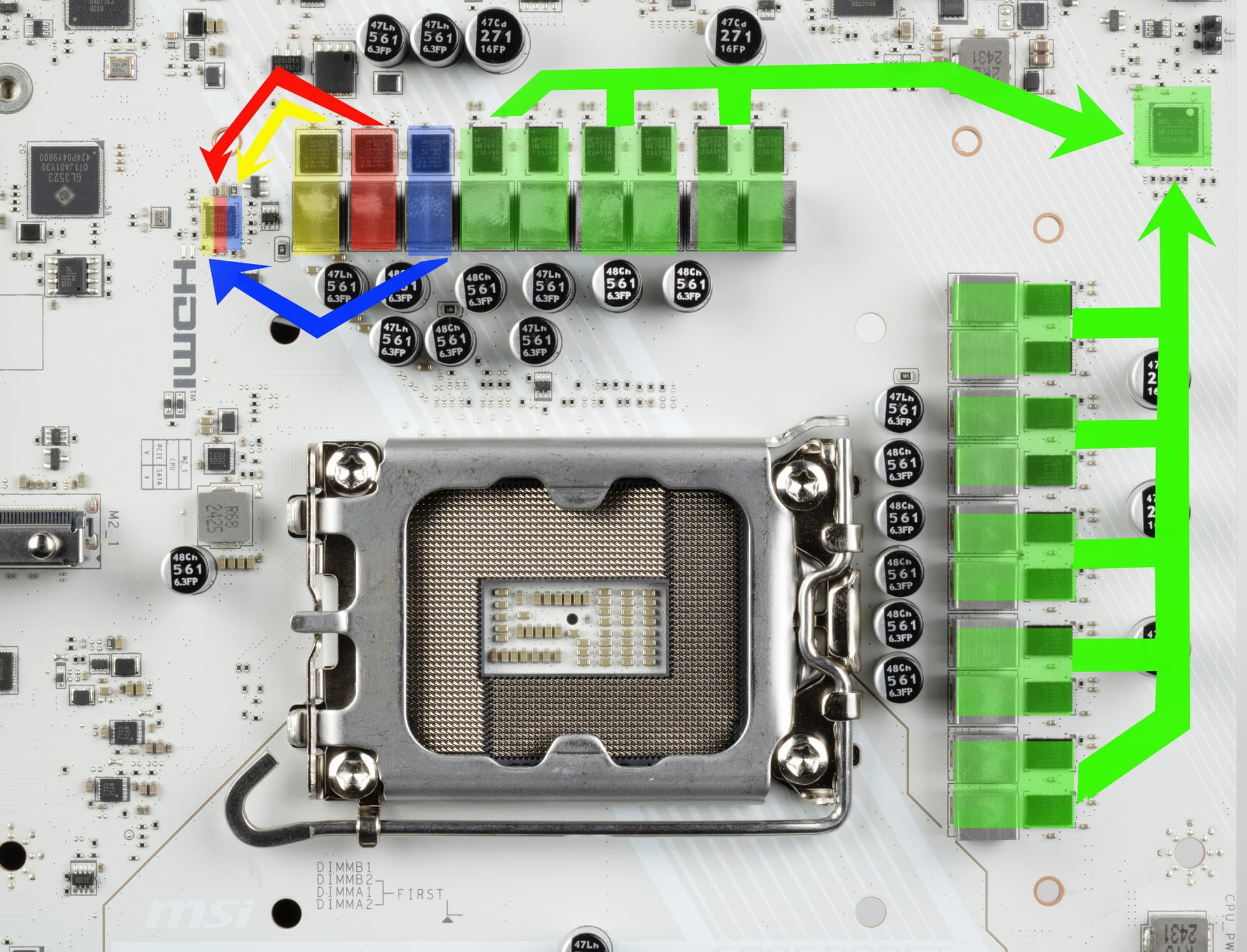 Каждый канал фазы питания VCCSA, iGPU и VNNAON кроме дросселя имеет MP87661 DrMOS от MPS на 60 А.