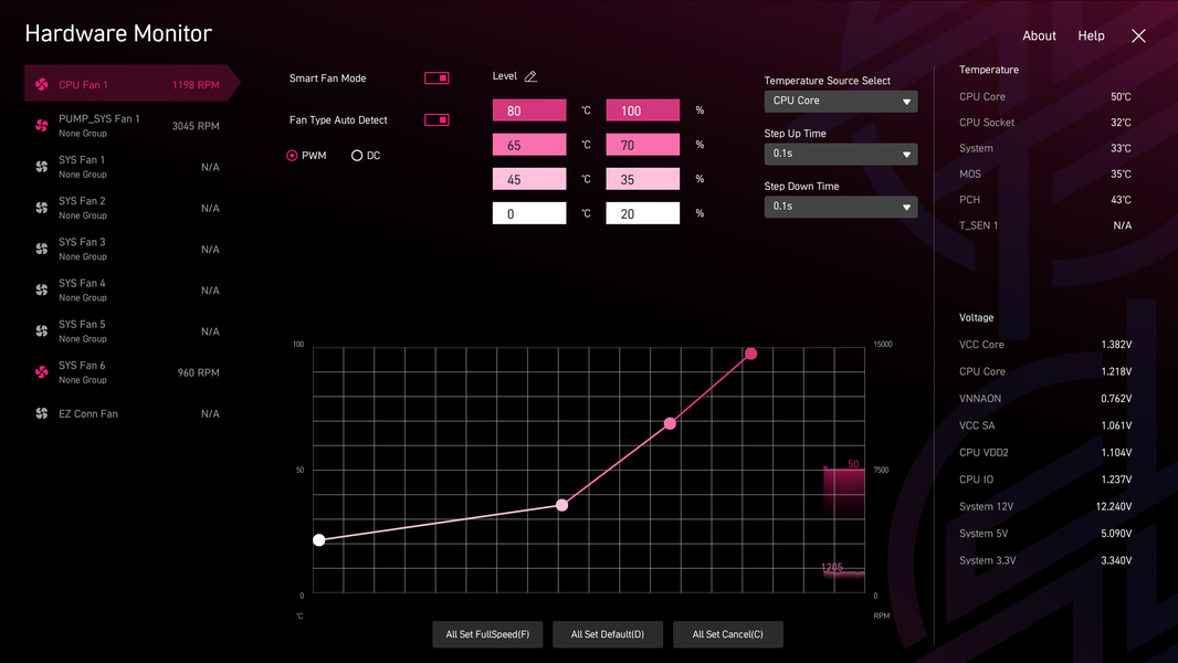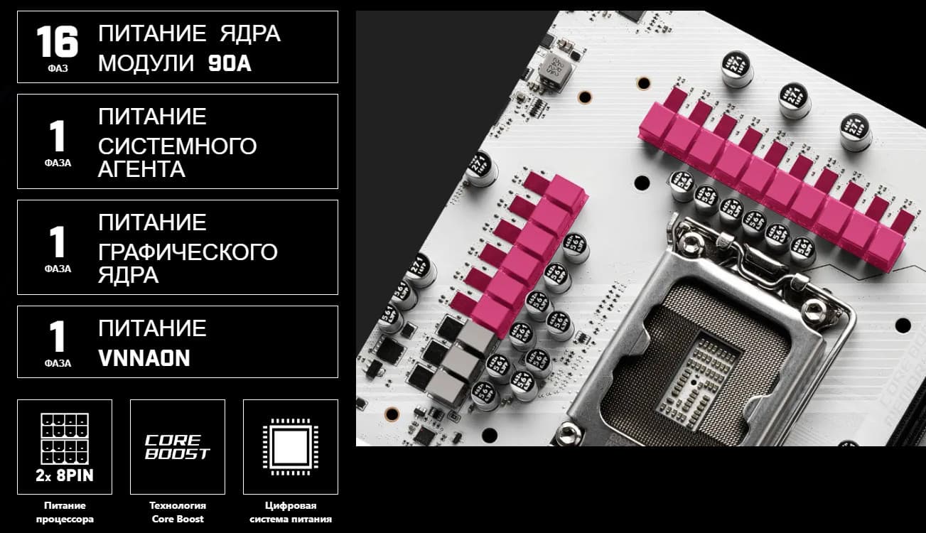 Схема питания процессора выполнена по схеме 16+1+1+1 (всего 19 фаз: 16 на VCore (ядро процессора), 1 на iGPU (интегрированное графическое ядро), 1 на VCCSA (System Agent, кольцевая шина) и 1 на VNNAON (управление энергосбережением).