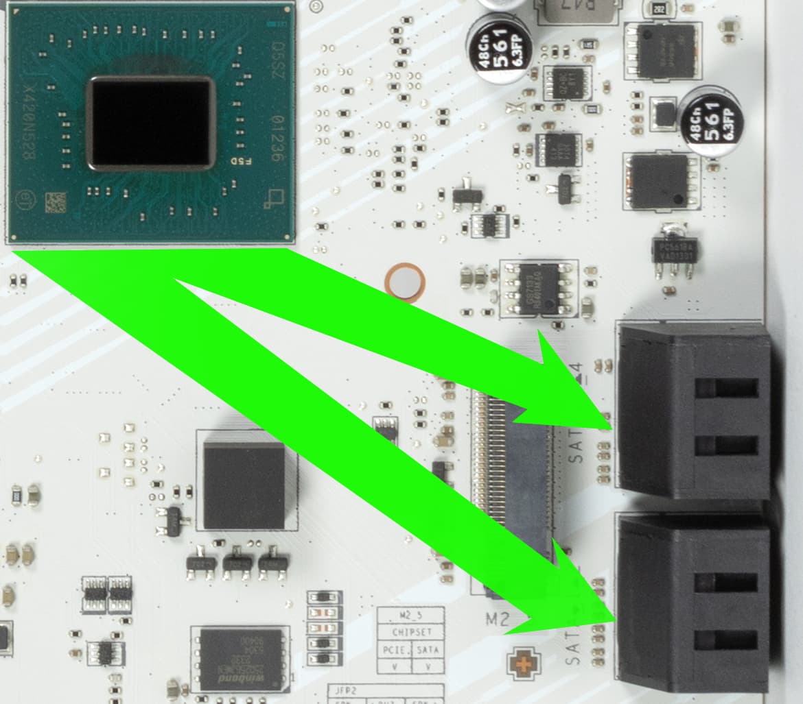 Поскольку нет деления ресурсов уже между слотами M.2, портами SATA и слотами расширения PCIe, то и мультиплексоров нет.