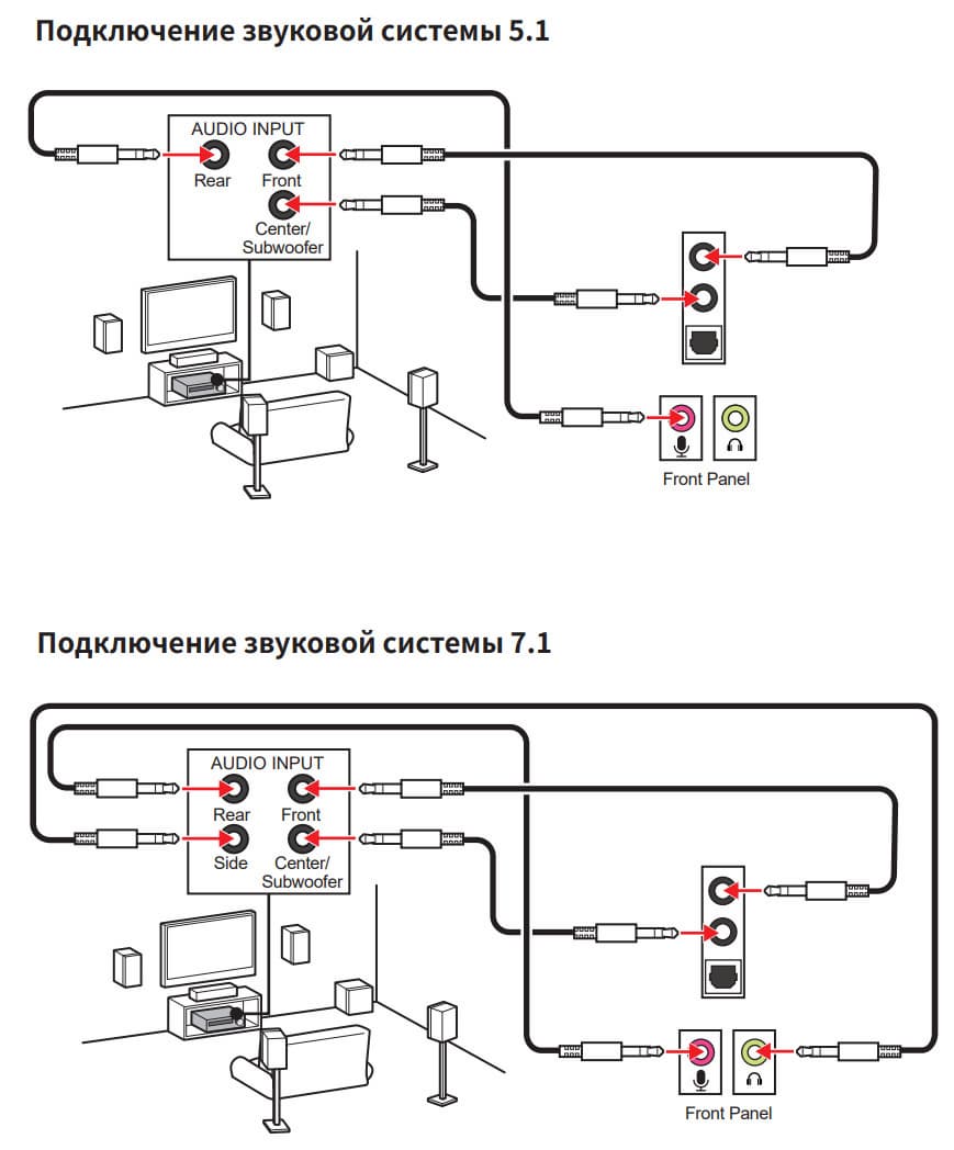 Вывод по схемам 4.0, 5.1 и 7.1 возможен только через использование аудиогнезд на передней панели корпуса совместно с двумя гнездами на самой плате, а также через S/PDIF. Настройка схем – с помощью ПО, скачиваемого с сайта производителя.