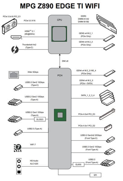 При этом взаимодействие с Z890 идет по особому каналу Digital Media Interface 4.0 (DMI 4.0 x8). Serial Peripheral Interface (SPI) используется для взаимодействия с системой UEFI/BIOS, а шина Low Pin Count (LPC) — для связи с устройствами ввода/вывода, не требующими высокой пропускной способности (контроллерами вентиляторов, TPM, старой периферии). HDA более не используется, связь с аудиокодеками идет с помощью линий USB 2.0.