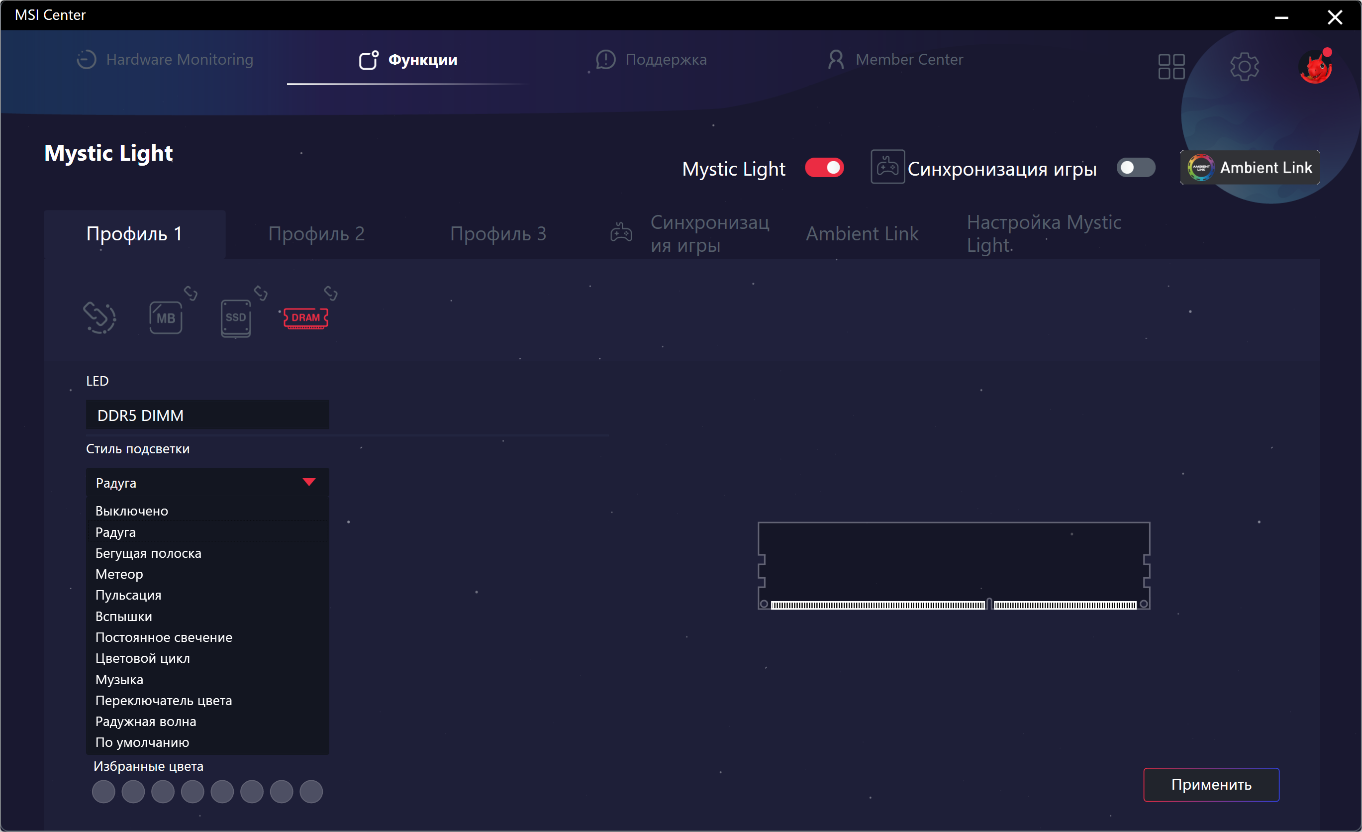 Формально имеется поддержка памяти DDR5 до 6400 МТ/с, однако всем хорошо известно, и производители материнских плат это активно рекламируют: через XMP-профили сейчас можно использовать пропускную способность до 8000 и выше МТ/с. В частности данная плата поддерживает ПСП до 9200 МТ/с.