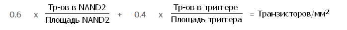 Вместо этого Intel предложила определять возможности техпроцесса по новой формуле, в которую входят площади типовых блоков — простейшего вентиля 2-NAND (двухвходовый логический элемент «и-не») и более сложного синхронного триггера — и число транзисторов в них; их отношения умножены на «правильные» коэффициенты, отражающие относительную распространенность простых (0,6) и сложных (0,4) элементов. Сразу можно заподозрить, что все цифры подобраны для еще более наглядной демонстрации лидерства Intel в сравнении с «другими производителями». Но чуть позже всё стало выглядеть так, будто компания движется вспять, очередной оптимизацией техпроцесса добиваясь худшей плотности: исходный 14-нанометровый процесс (вышедший аж в 2014 г.) имел 44,67 МТр/мм², а дважды обновленный «14++ нм» (образца 2017 г.) — 37,22 МТр/мм². На самом деле это размен с потреблением энергии, которое в «двухплюсовой» версии процесса уполовинилось (опять же — со слов Intel).