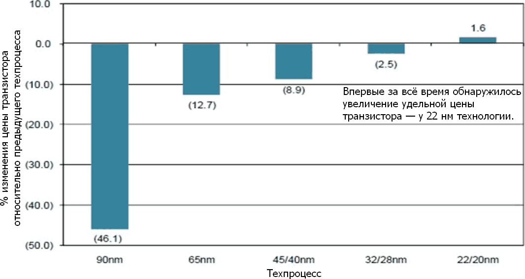 Другая проблема, возникающая в этой связи — стоимость каждого транзистора. Все предыдущие 60 лет развития микроэлектроники основывались на уверенности в том, что даже несмотря на постоянное увеличение цены заводов и разработки техпроцессов и чипов цена самих чипов в пересчете на транзистор будет все время уменьшаться. Так и происходило — примерно до 32 нм, после которых наступил раскол: микросхемы памяти продолжили дешеветь на единицу объема (особенно это коснулось флэш-памяти, которая массово перешла на объемное хранение данных на десятках уровней — технология 3D-NAND), а вот логика сильно затормозилась. Да, последние версии техпроцессов 14 нм предлагают транзисторы все же чуть дешевле, чем у 22 нм — но именно что «чуть», и это после стольких лет возни. Да и производительность при том же потреблении энергии хоть и растет, но всё медленнее…