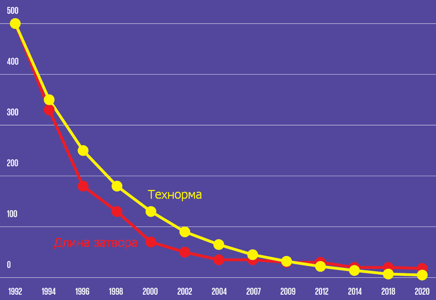До субмикронных технорм (когда их и измеряли микронами, а не нанометрами) действовало простое лямбда-правило (этой греческой буквой обозначается длина волны света): если не считать разные оптические тонкости, влияющие на так называемую числовую апертуру, то при уменьшении длины волны вдвое можно формировать вдвое меньшего размера и сами структуры, главная из которых — длина затвора транзистора. Это дает вдвое бо́льшие достижимые частоты, вдвое меньшее напряжение питания и ввосьмеро (!) меньшее потребление на одно переключение транзистора между открытым и закрытым состояниями. Ясно, что такие идеалы вообще ни в какой микросхеме ни разу не соблюдались, но лучшие образцы вполне приближались к ним. (Тут автор позволит себе освободить читателя от созерцания лишних формул и таблиц.)