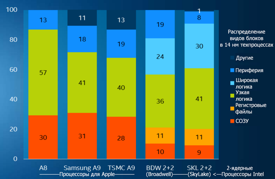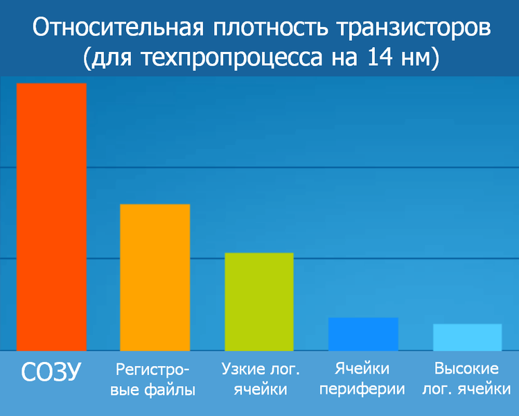 Внимательный читатель тут же заметит, что у микроэлектронной отрасли уже есть один интегральный показатель, позволяющий оценить эффективность техпроцесса по плотности транзисторов без привязки к величине нанометров: вышеупомянутая площадь шеститранзисторной ячейки СОЗУ, также являющейся распространенным строительным блоком для микросхем. Число ячеек заметно влияет на общую степень интеграции в виде среднего числа транзисторов на единицу площади кристалла. Тут Intel пошла на компромисс, предложив не отказаться от площади СОЗУ, а сообщать ее отдельно — учитывая, что в разных микросхемах соотношение сумм площадей ячеек памяти и логических блоков сильно отличается. Впрочем, даже с этим учетом на практике пиковая плотность невозможна и по другой причине: плотности тепловыделения. Чипы просто перегреют себя наиболее горячими местами, расположенными слишком близко друг к другу при высокоплотном дизайне. Поэтому их разряжают чем-то менее горячим (например, емкой памятью) и/или малоплотным (как контроллеры периферийных шин). И это еще без учета аналоговых элементов, которые в такие формулы не вписываются в принципе…