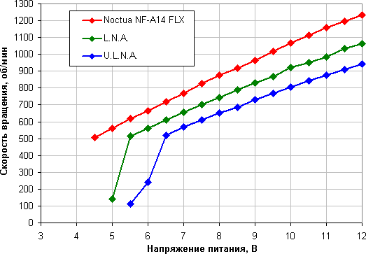Характер зависимости типичный: плавное и почти линейное снижение скорости вращения при изменении напряжения от 12 В до минимального напряжения стабильной работы. Этот порог не зависит от наличия вставки и равен примерно 500 об/мин. От 5 В без раскрутки вентилятор не запустится. А в случае вставки U.L.N.A. вентилятор может не запуститься и при плавном повышении напряжения до 12 В, но после подачи где-то 6 В запускается при повышении напряжения до 7,1 В (см. таблицу выше). Видно, что вставки L.N.A. / U.L.N.A. не очень сильно снижают скорость вращения, поэтому, возможно, пользователю придется снижать напряжение питания для уменьшения скорости вращения (и шума). При желании вставки можно подключить последовательно, что еще больше снизит скорость вращения при фиксированном напряжении, но такой тест мы не проводили.
