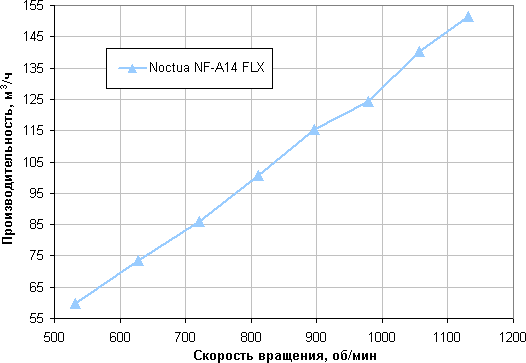 Напомним, что в этом тесте мы создаем некое аэродинамическое сопротивление (весь поток воздуха проходит через крыльчатку анемометра), поэтому полученные значения отличаются в меньшую сторону от максимальной производительности в характеристиках вентилятора, так как последняя приводится для нулевого статического давления (отсутствует аэродинамическое сопротивление).