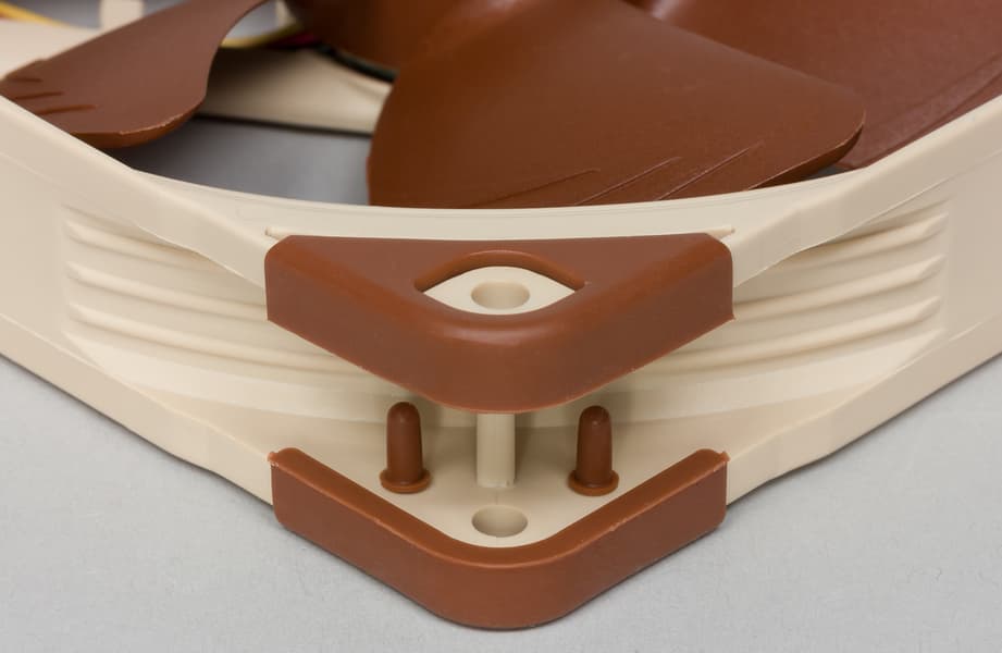 На углах рамки закреплены традиционные виброизолирующие накладки. Польза от них и от антивибрационных крепежных стоек нулевая, что было нами доказано (см. Процессорные охладители Noctua для разъема AM4 и Обзор вентиляторов Noctua серий NF-A12x25 и NF-P12 redux).