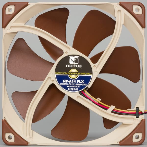 В серию вентиляторов Noctua NF-A14 входит несколько моделей: с ШИМ-управлением и без, с питанием от 12 В и от 5 В. У нас на тестирование побывал вентилятор серии Noctua NF-A14 FLX без управления с помощью ШИМ, но с двумя адаптерами, снижающими скорость вращения при том же напряжении питания. Предполагается, что пользователь при необходимости снижения шума от вентилятора выберет подходящий адаптер.