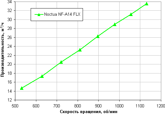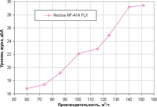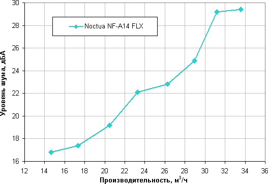 В современных условиях и в потребительском сегменте эргономика, как правило, имеет приоритет над производительностью, поэтому зафиксируем уровень шума на значении 25 дБА. Теперь для оценки вентиляторов достаточно сравнивать их производительность при данном уровне шума.