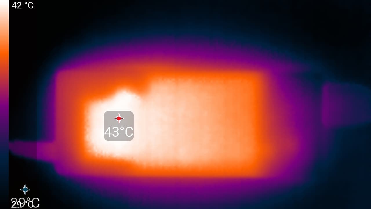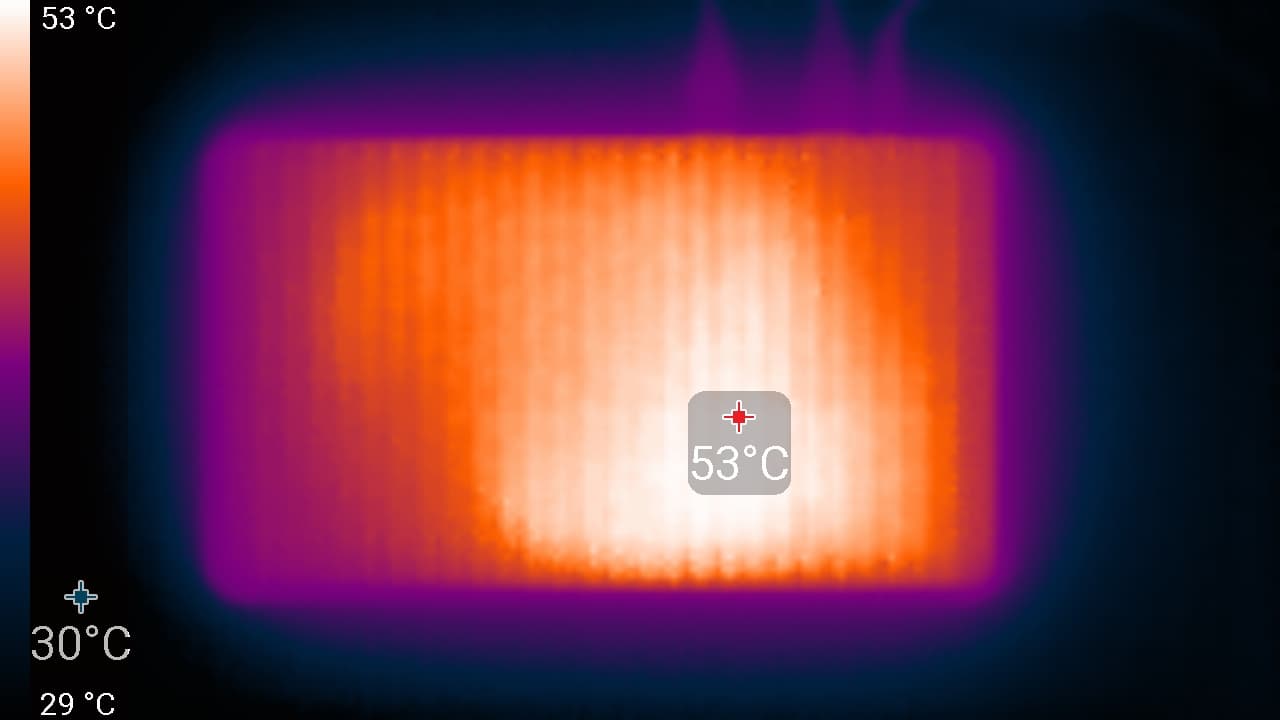 По теплоснимку видно, что, непосредственно в зоне контакта с младшим элементом температура стабилизируется на 53 °C. Старший добавляет к этому еще около пяти градусов — обжечься все еще не получится, но хвататься без необходимости не стоит. Мешать естественному теплообмену — тоже. И в случае компьютера, и для блока питания это верно (его снимок нижний — так бы можно было бы и перепутать). Понятно, что нагрузка в «грелках» синтетическая, а в реальности никто не будет заставлять такие компьютеры заниматься перекодированием видео и прочим рендерингом, но такова цена пассивного охлаждения. Главное, что и в таких условиях ничего не перегревается — почему и эти корпуса довольно громоздкие (активное охлаждение, как уже было сказано, размеры корпусов сильно сокращает).