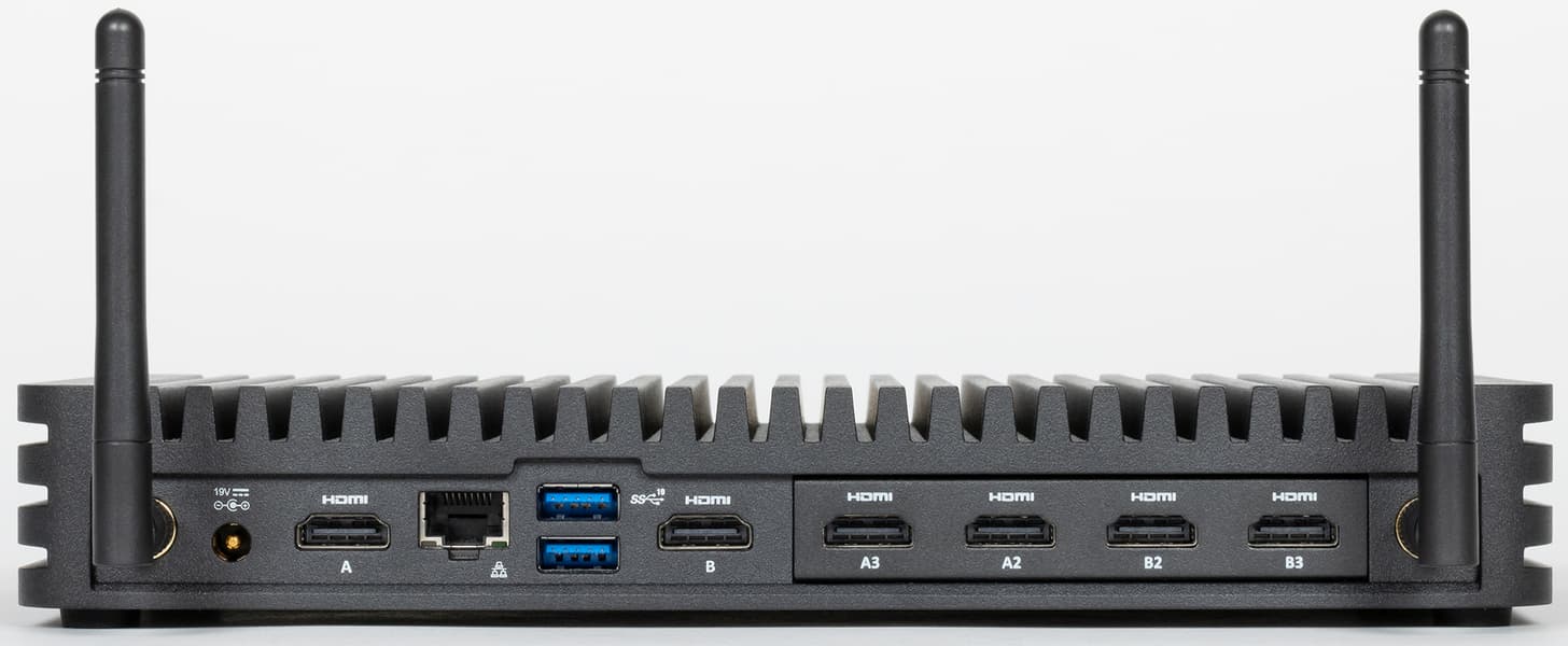 А вот если взглянуть на заднюю панель корпуса CMCR1ABC, то мы увидим совсем другие элементы. Проводной гигабитный Ethernet остался один, да и порты USB 2.0 исчезли. Место понадобилось для того, чтобы разместить здесь целых шесть портов HDMI — разбитых на два канала, каждый из которых рассчитан на подключение устройства отображения с разрешением 5760×1080 (triple-wide FHD), что массово используется в ресторанах быстрого обслуживания.