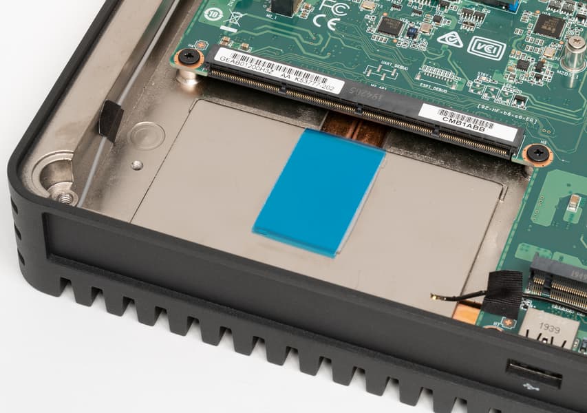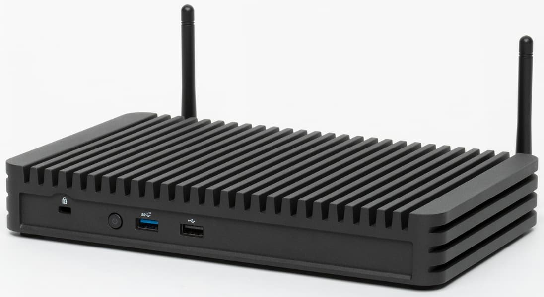 Начнем с CMCR1ABB. Брутальный черный брусок размерами 254×152×36 мм (1,4 литра). Это больше, чем у «квадратных» NUC, но причины понятны — большая часть корпуса работает как радиатор, поскольку никаких вентиляторов внутри нет. Заметим, что немалое количество «китайских мини-ПК» на аналогичном железе и с пассивом компактнее — но в итоге большинство обзоров таковых посвящены всего одной теме: как доработать охлаждение до уровня, когда оно начнет справляться с чем-то более сложным, чем просмотр видео или там редактирование офисных документов. Здесь такой вопрос не стоит — под серьезной многочасовой нагрузкой корпус сильно нагревается, но процессор и прочие компоненты не перегреваются.