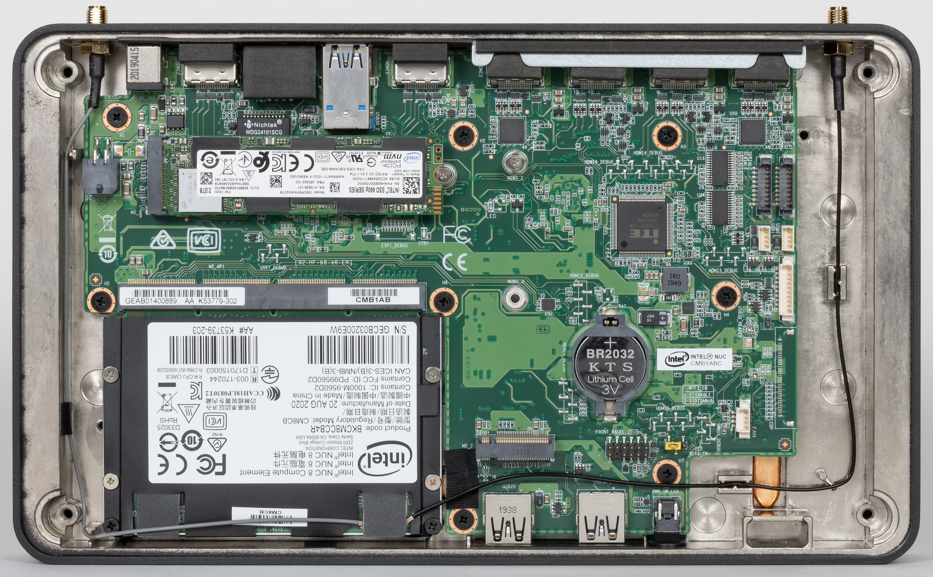 Внутри это все и всегда конструктивно схоже — есть плата с разъемом под NUC 8 Element, который и «доводит» систему до готовности к использованию. При выборе моделей линейки Essential, снабженных eMMC, больше можно ничего не подключать. Но можно и установить один или два SSD — один из которых может быть SATA или NVMe, а второй — только NVMe. Старшие NUC 8 Pro Elements помощнее — но к ним уже хотя бы один SSD добавить придется. Но и все — сами корпуса стоят каких-то 100—200 долларов, поскольку это просто корпус с пассивной платой и разъемами.