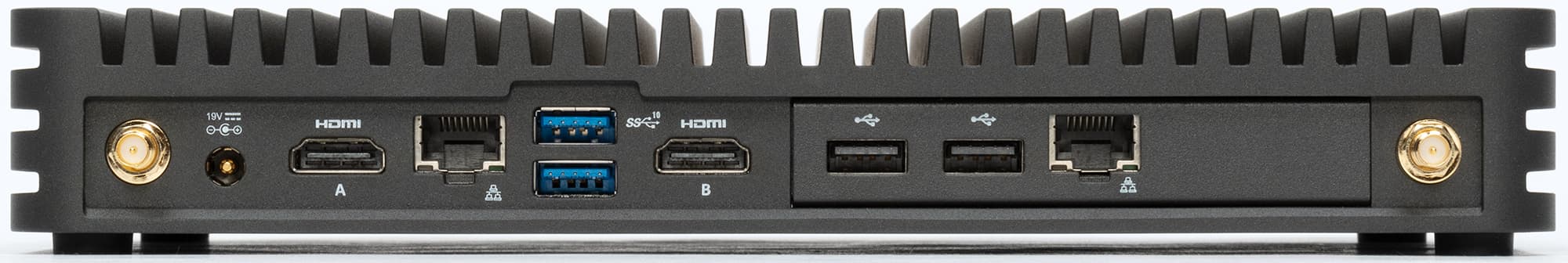 Вообще же это шасси рассчитано в первую очередь на разработчиков IoT — для чего, например, снабжена поддержкой пары проводных сетевых адаптеров. Кроме них на задней панели можно обнаружить два порта USB3 Gen2 и два USB 2.0 (еще по одному каждого типа есть спереди), пару HDMI, разъем блока питания и пару разъемов под антенны Wi-Fi.