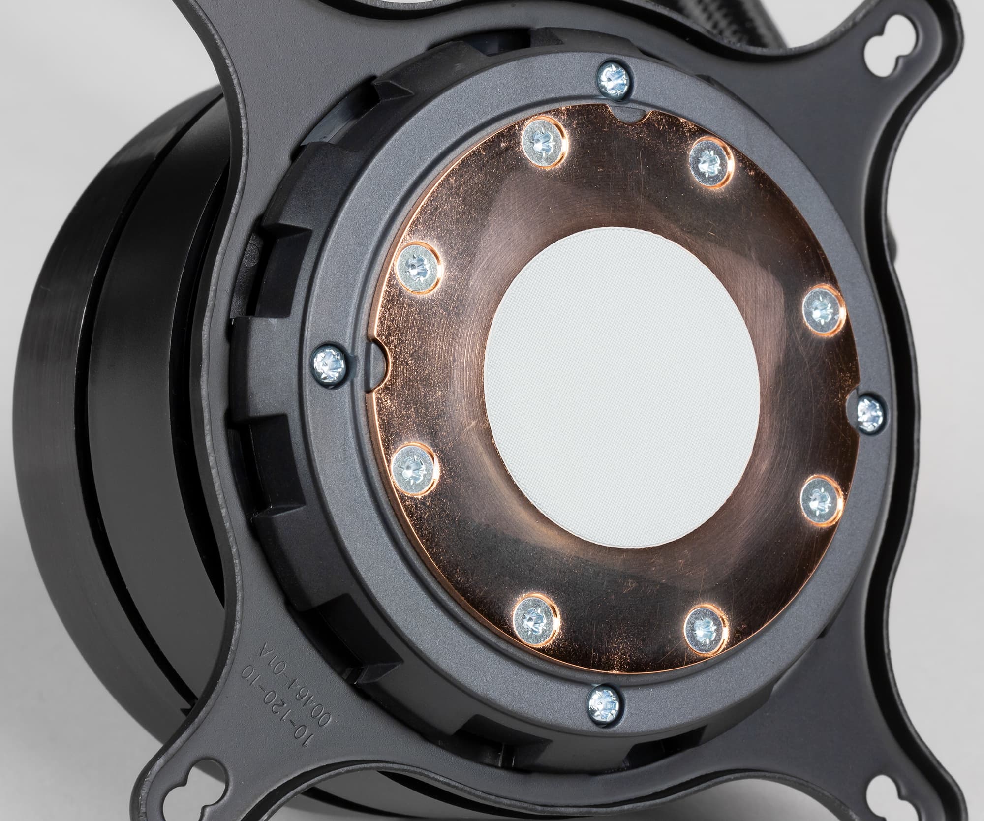 Диаметр этой пластины — 54 мм, а внутренняя часть, ограниченная отверстиями, имеет диаметр примерно 44 мм. Толщину медной подошвы мы не определили, так как часть ее, возможно, утоплена в корпус помпы. Подошва к центру чуть-чуть выпуклая. Центральную часть медного основания занимает нанесенная тонким слоем термопаста. Запаса для ее восстановления в комплекте поставки, к сожалению, нет. Забегая вперед, продемонстрируем распределение термопасты после завершения всех тестов. На процессоре:
